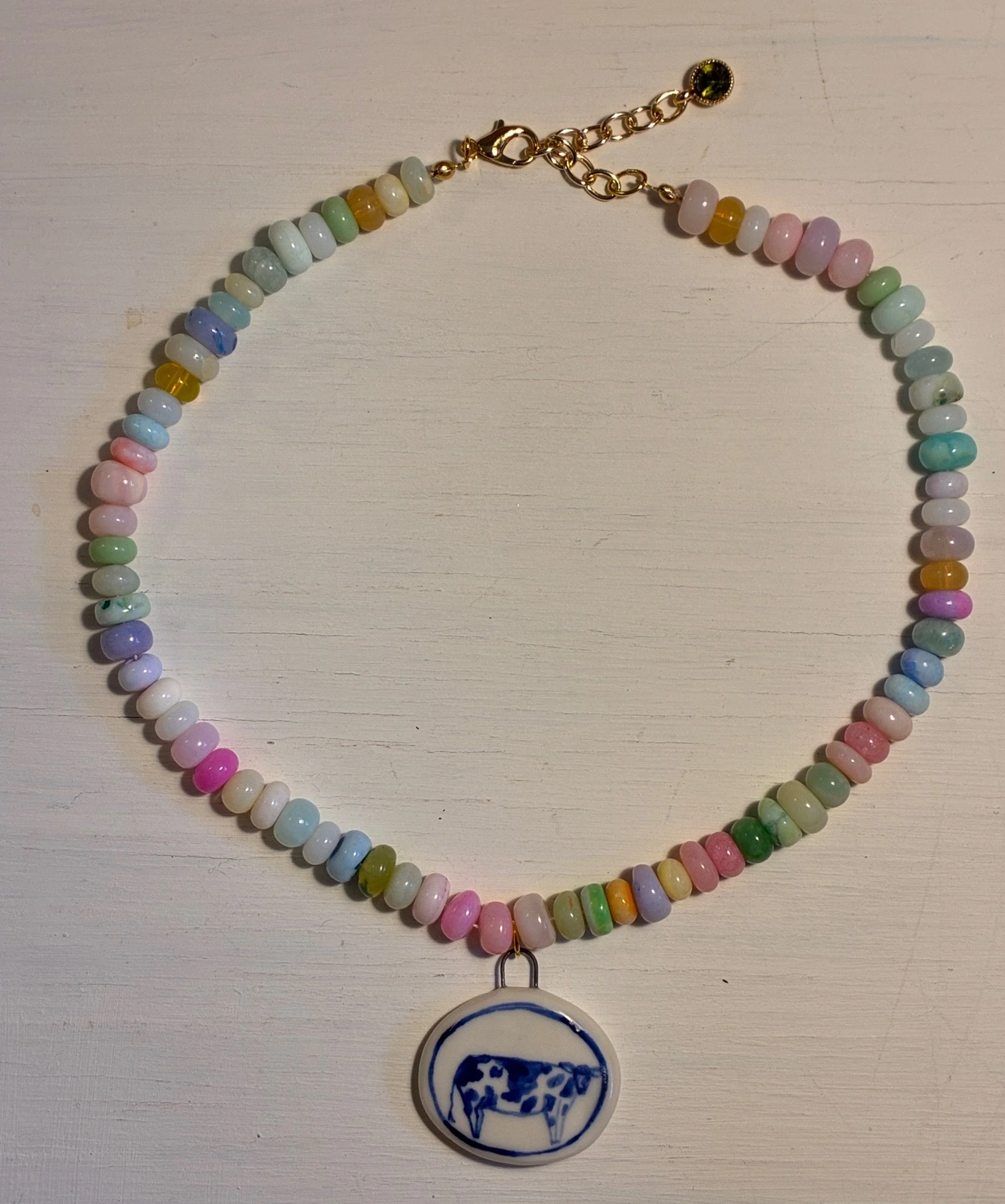 Hand painted porcelain charm on a candy necklace of smooth opal rondelle beads with gold plated findings.