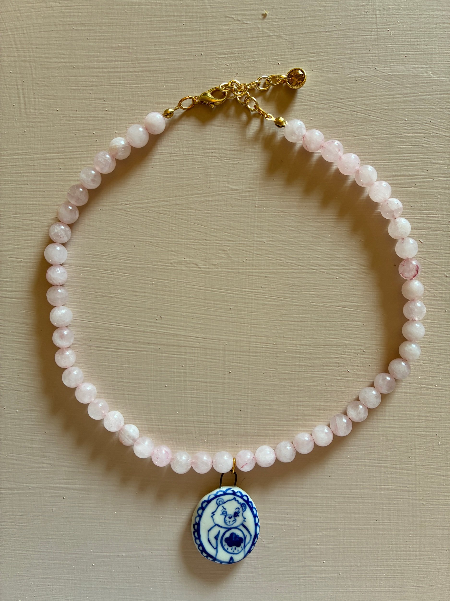 Hand painted porcelain charm on a necklace of Rose quartz beads with gold plated findings.