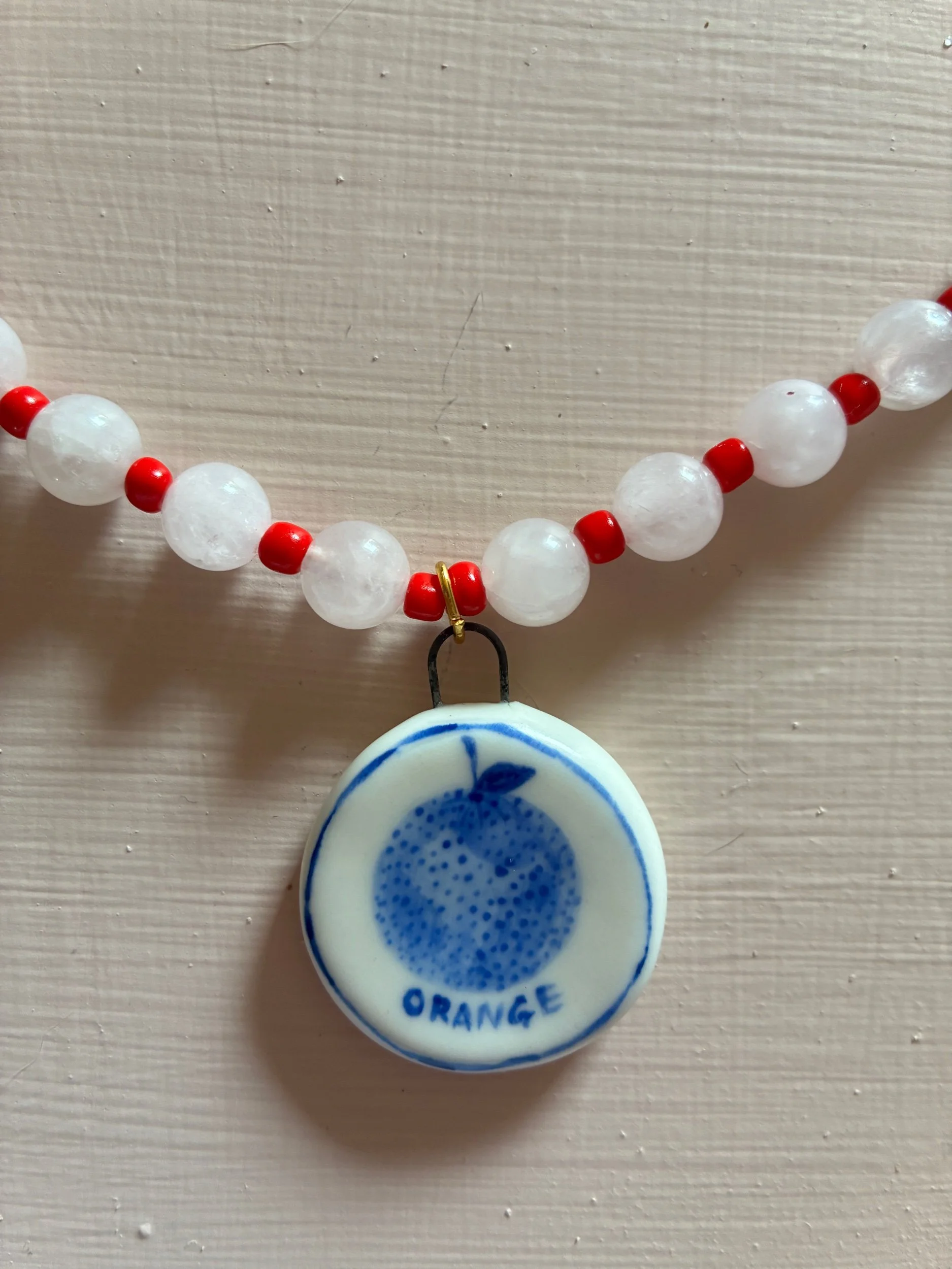 Hand painted porcelain charm on a necklace of rose quartz 8mm beads with glass seed beads and gold plated findings.