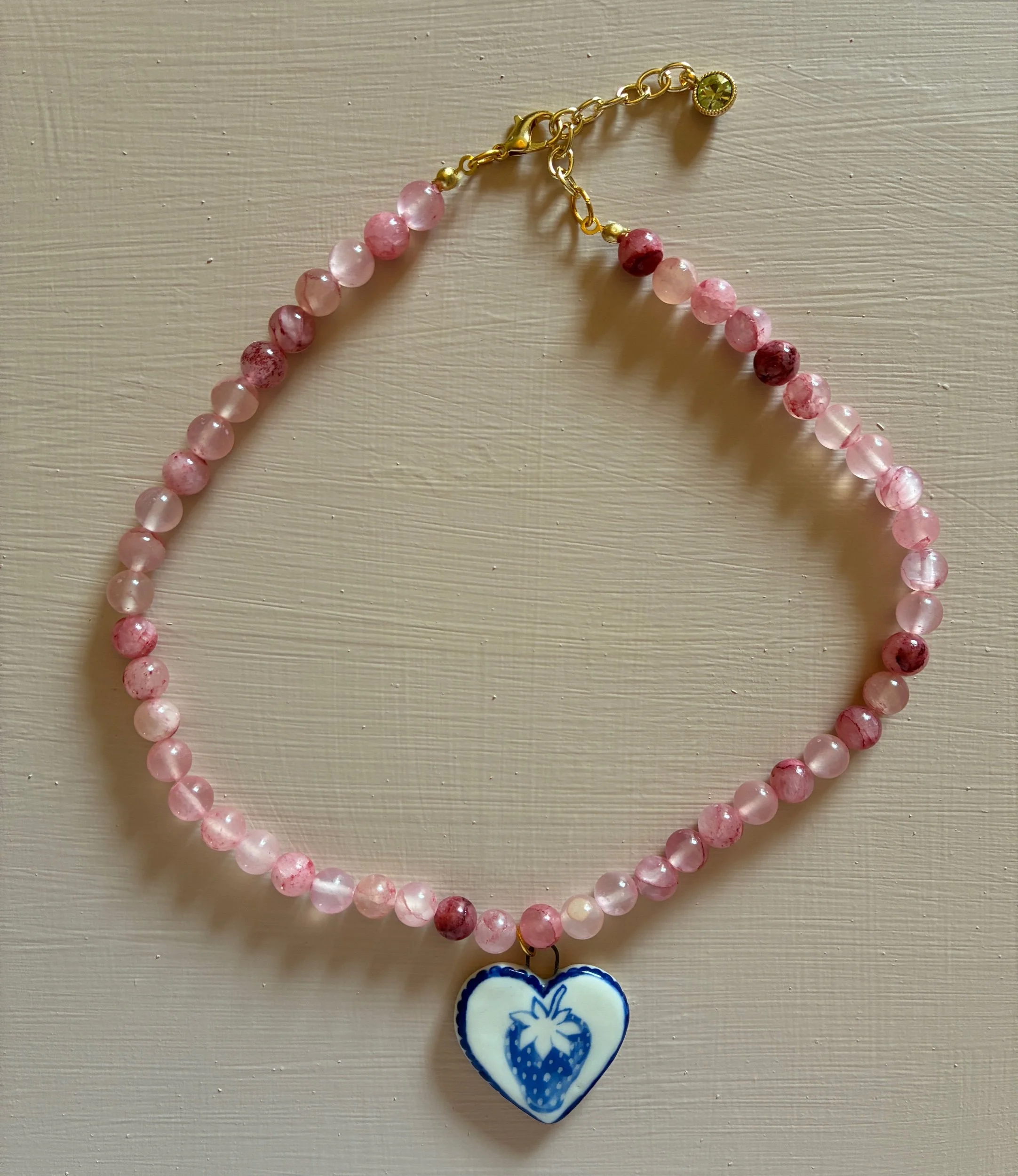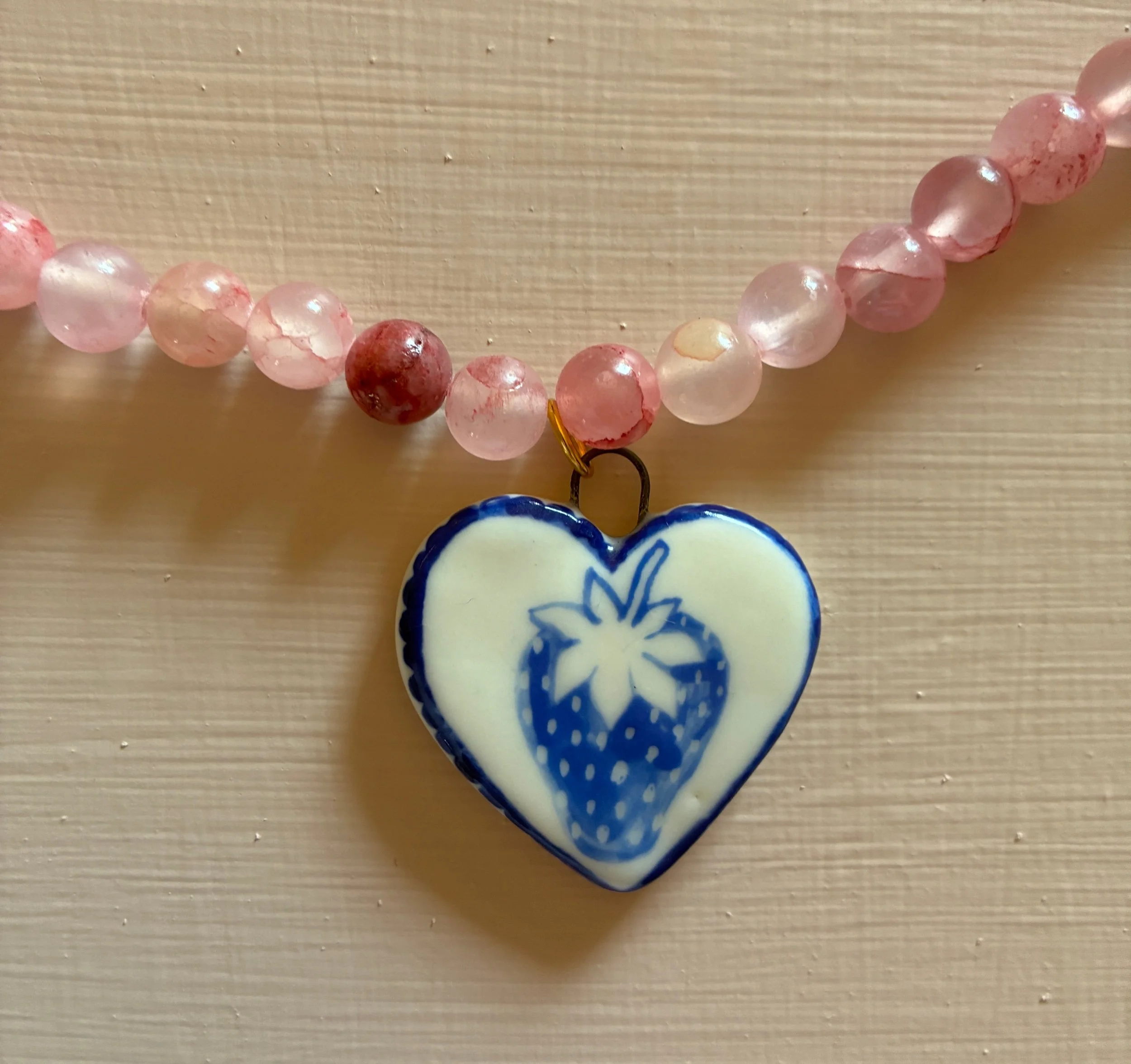 Hand painted porcelain charm on a natural red jade beaded necklace with gold plated findings.