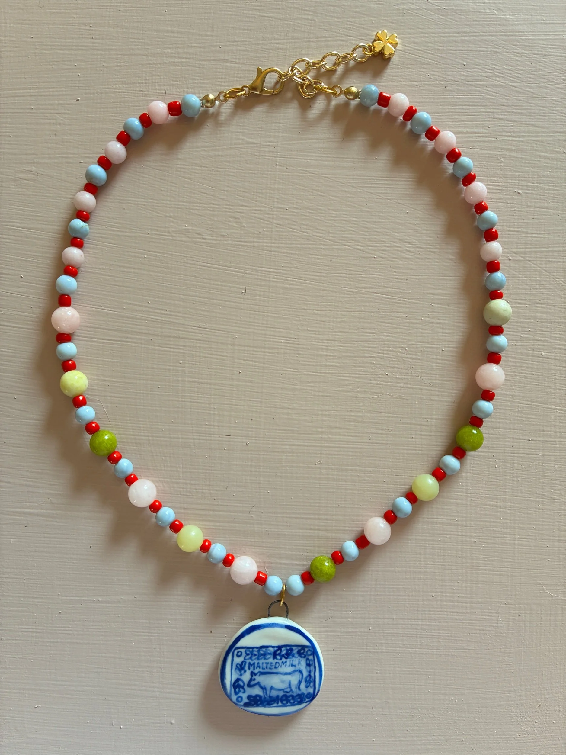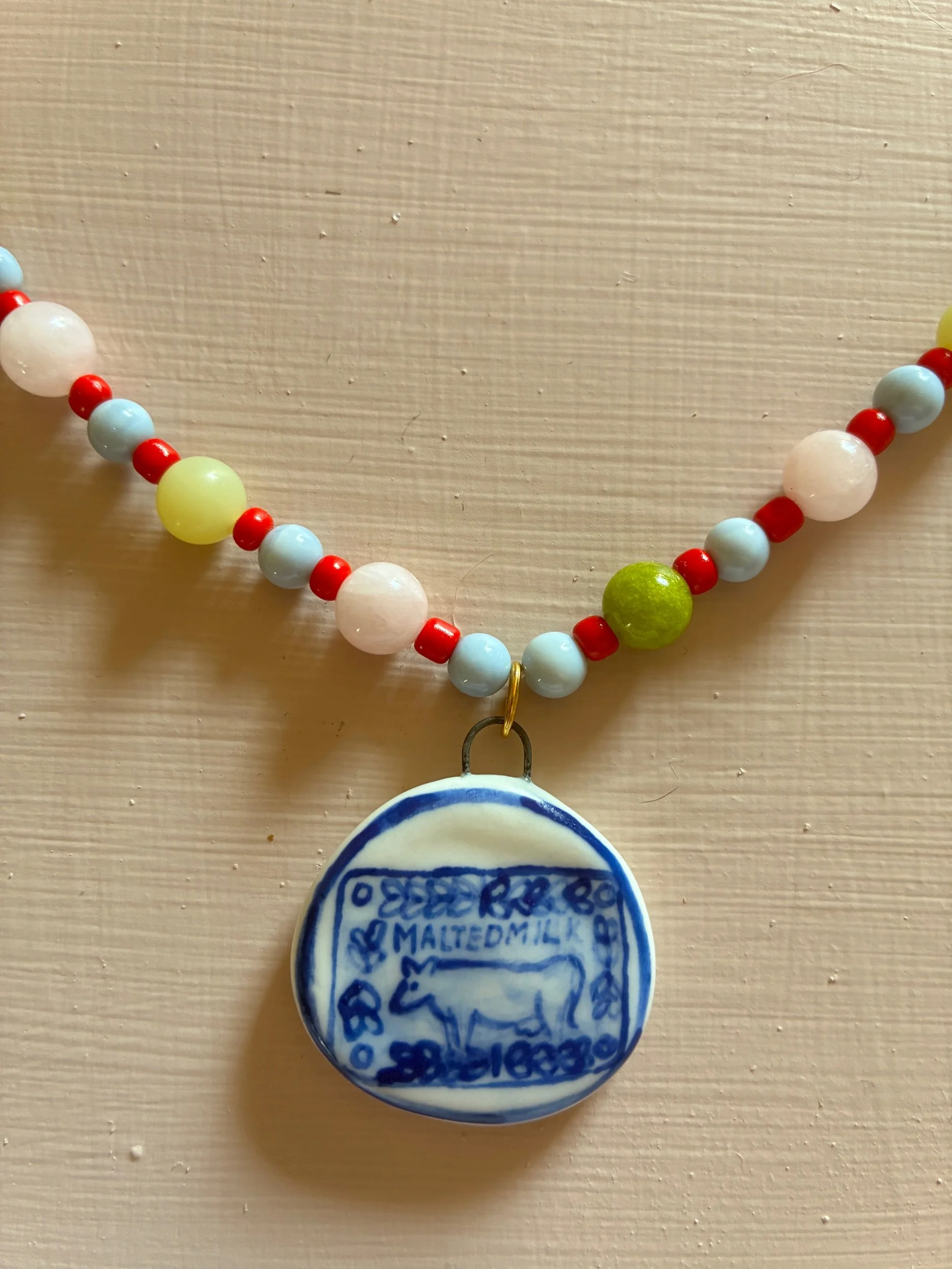 Hand painted porcelain charm on a necklace of mixed opal and jade gemstone beads with glass seed beads and gold plated findings.