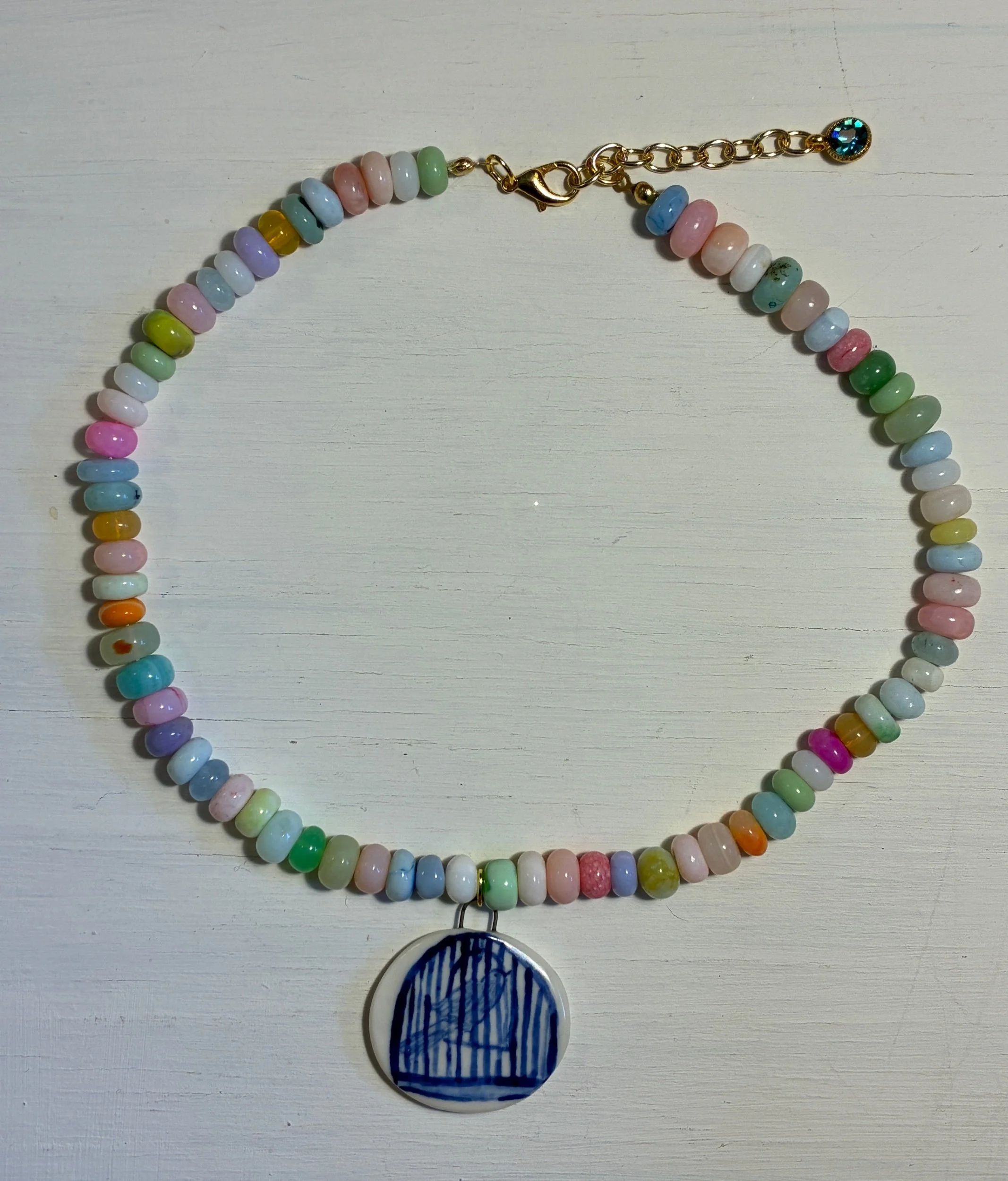 Hand painted porcelain charm on a candy necklace of smooth opal rondelle beads with gold plated findings.