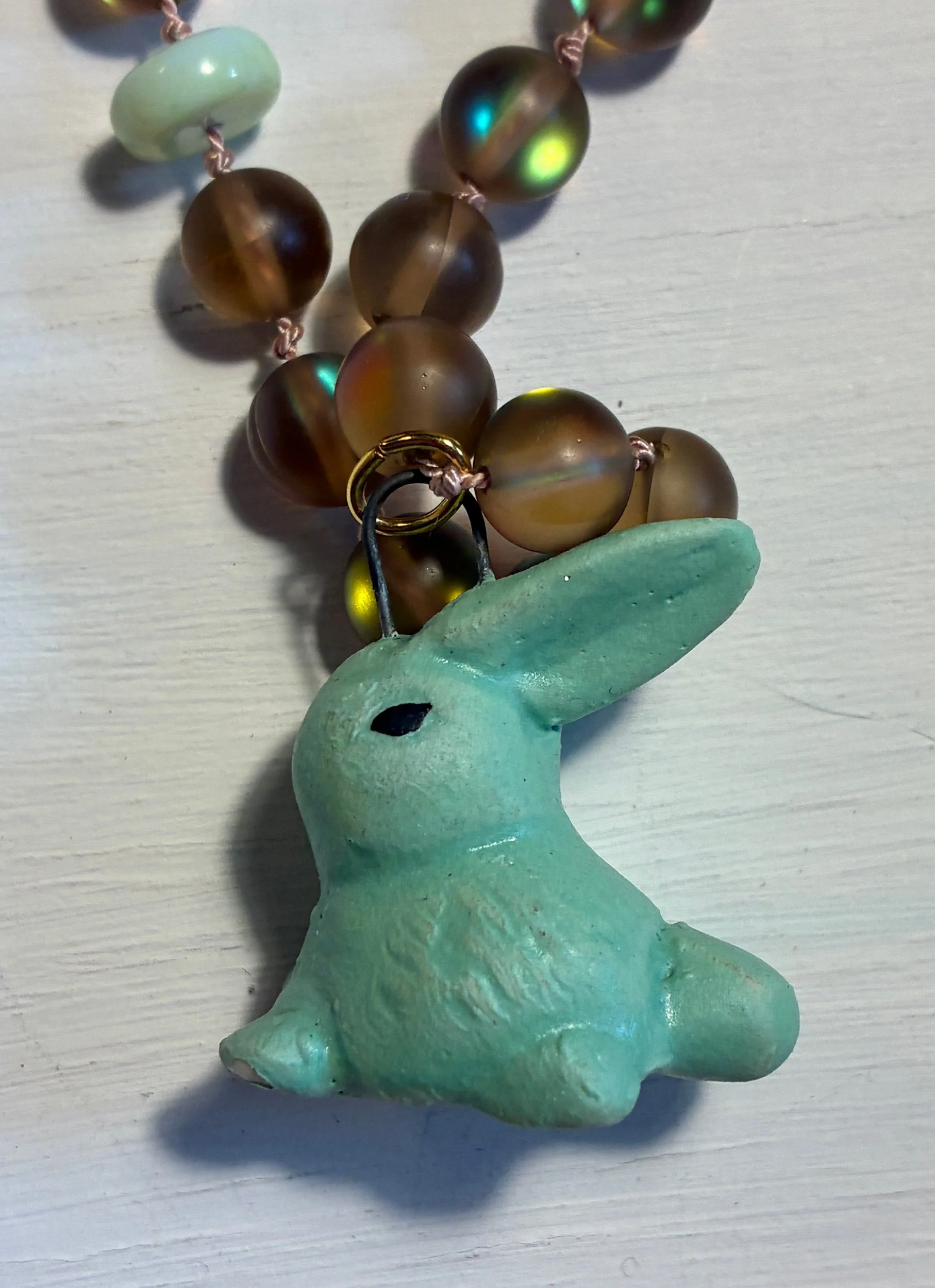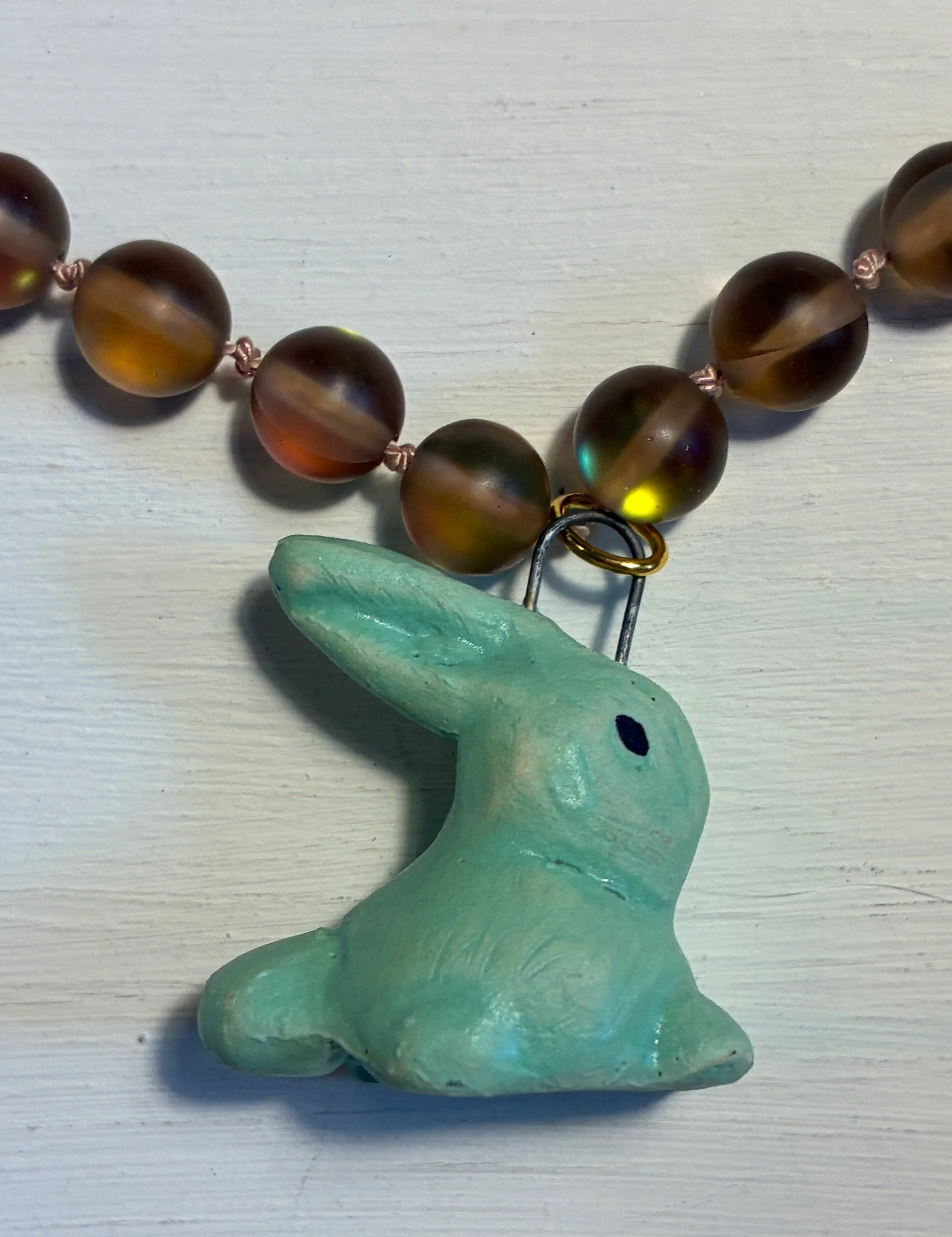 hand knotted Hand painted porcelain charm on a pink silk hand knotted necklace of 8mm hydrothermal quartz beads with gold plated findings.