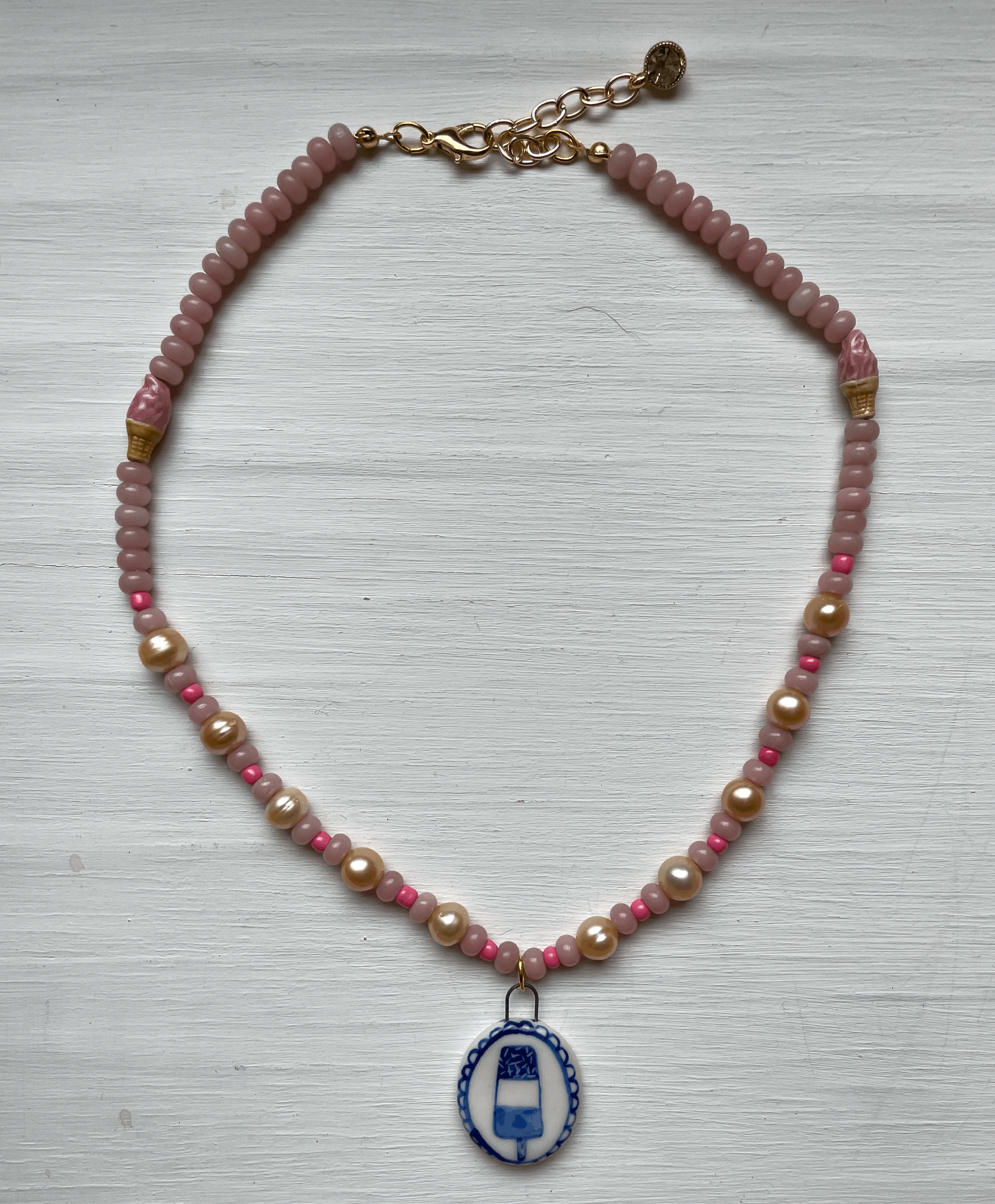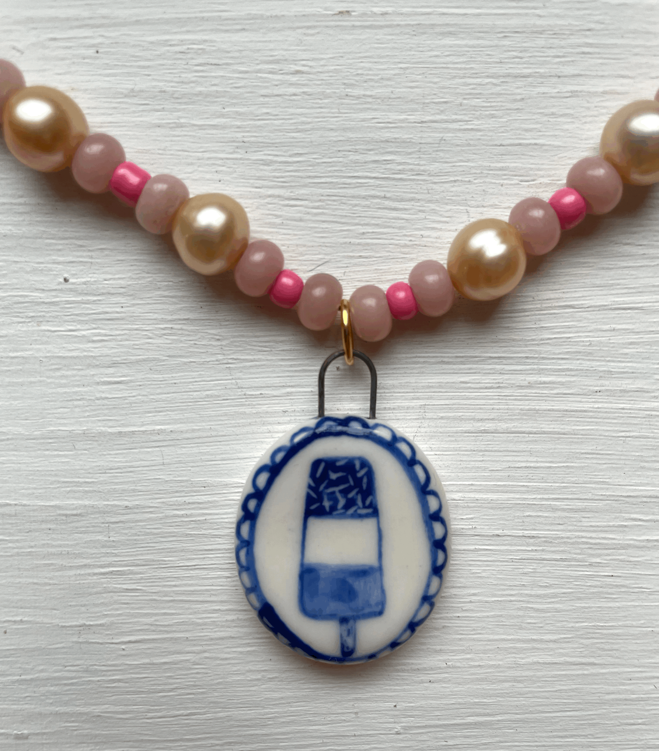 Hand painted porcelain charm on a pink stone beaded necklace with gold plated findings, freshwater pearls, ceramic beads and glass seed beads.