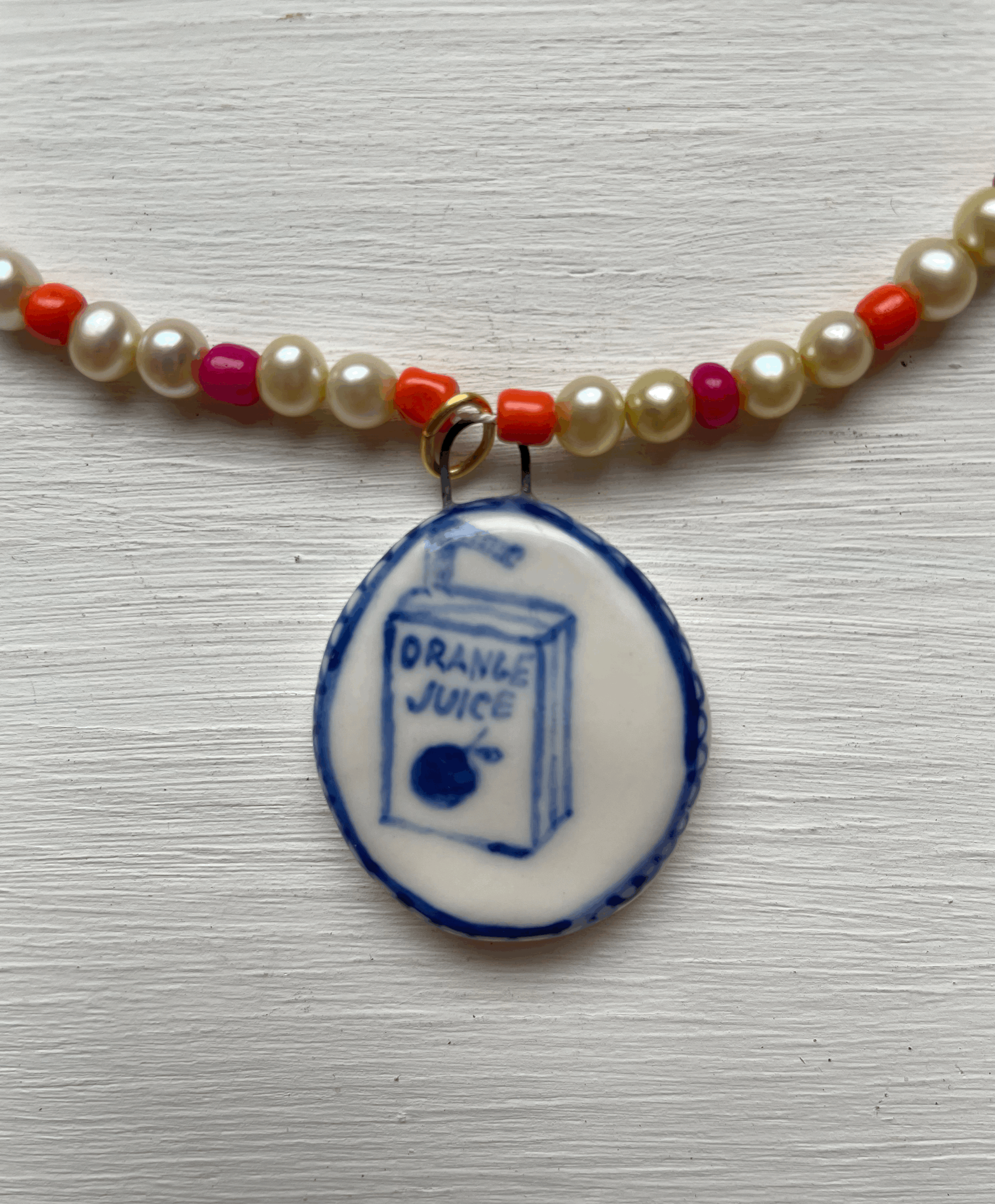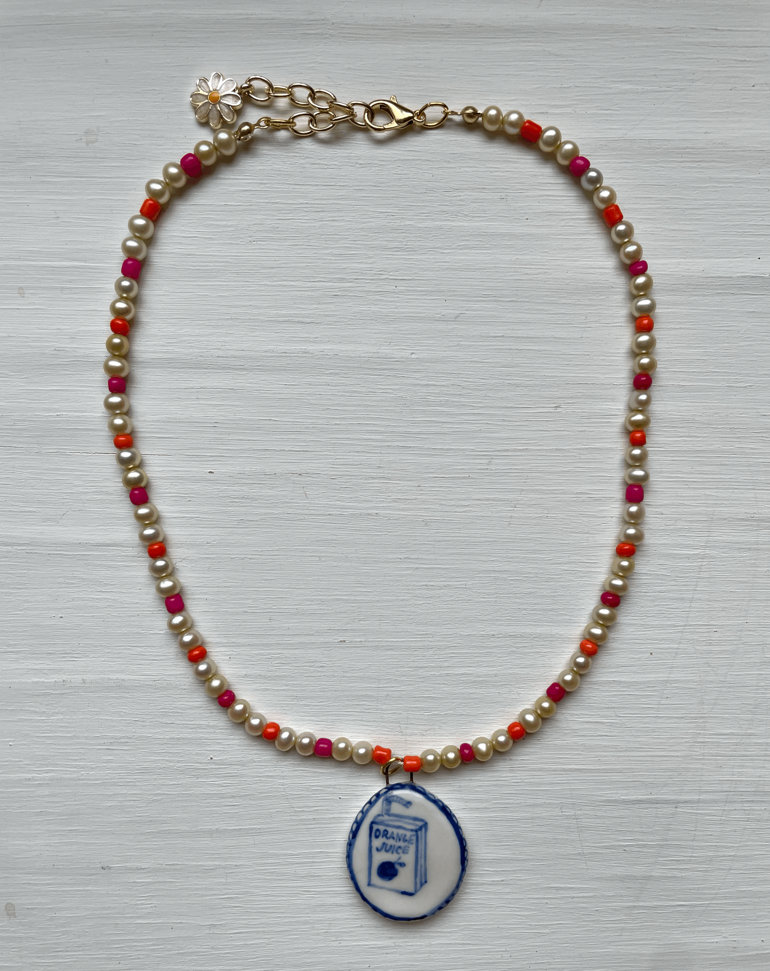Hand painted porcelain charm on a freshwater pearl beaded necklace with gold plated findings and glass seed beads.