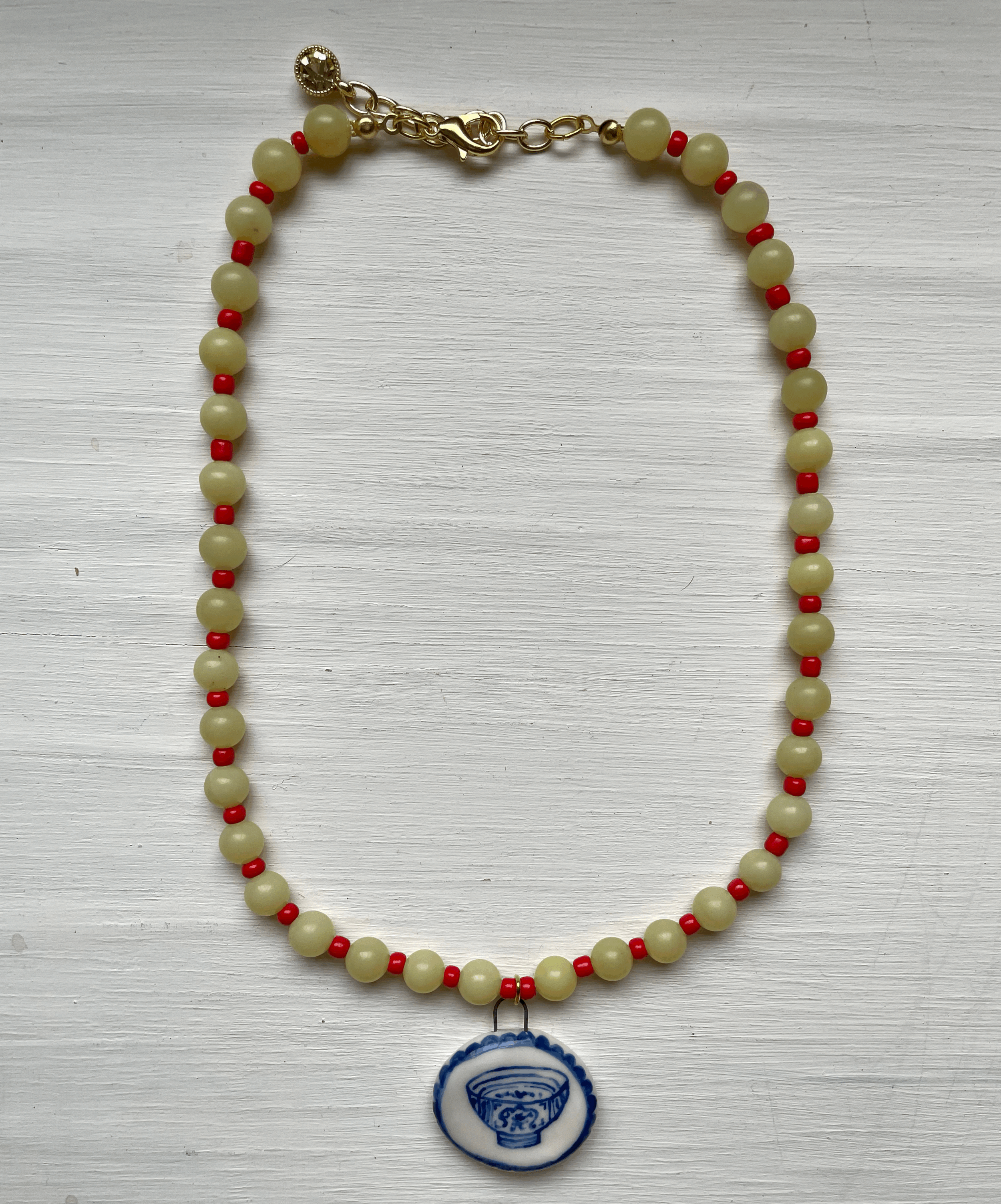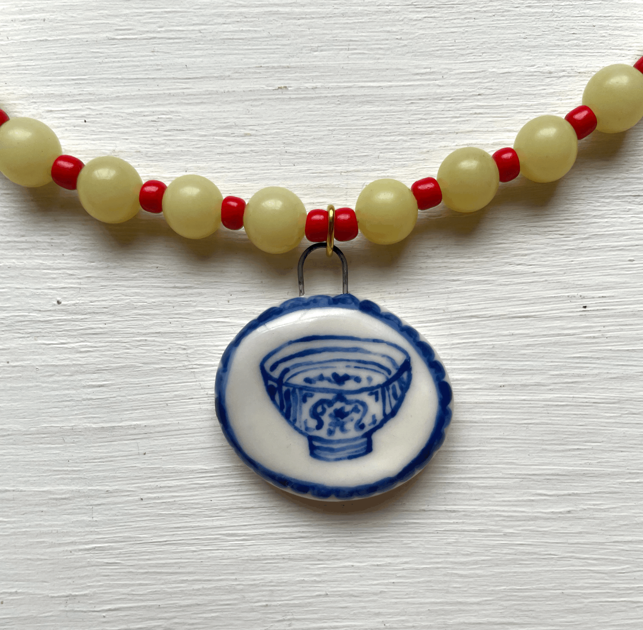 Hand painted porcelain charm on a yellow jade beaded necklace with gold plated findings and glass seed beads.