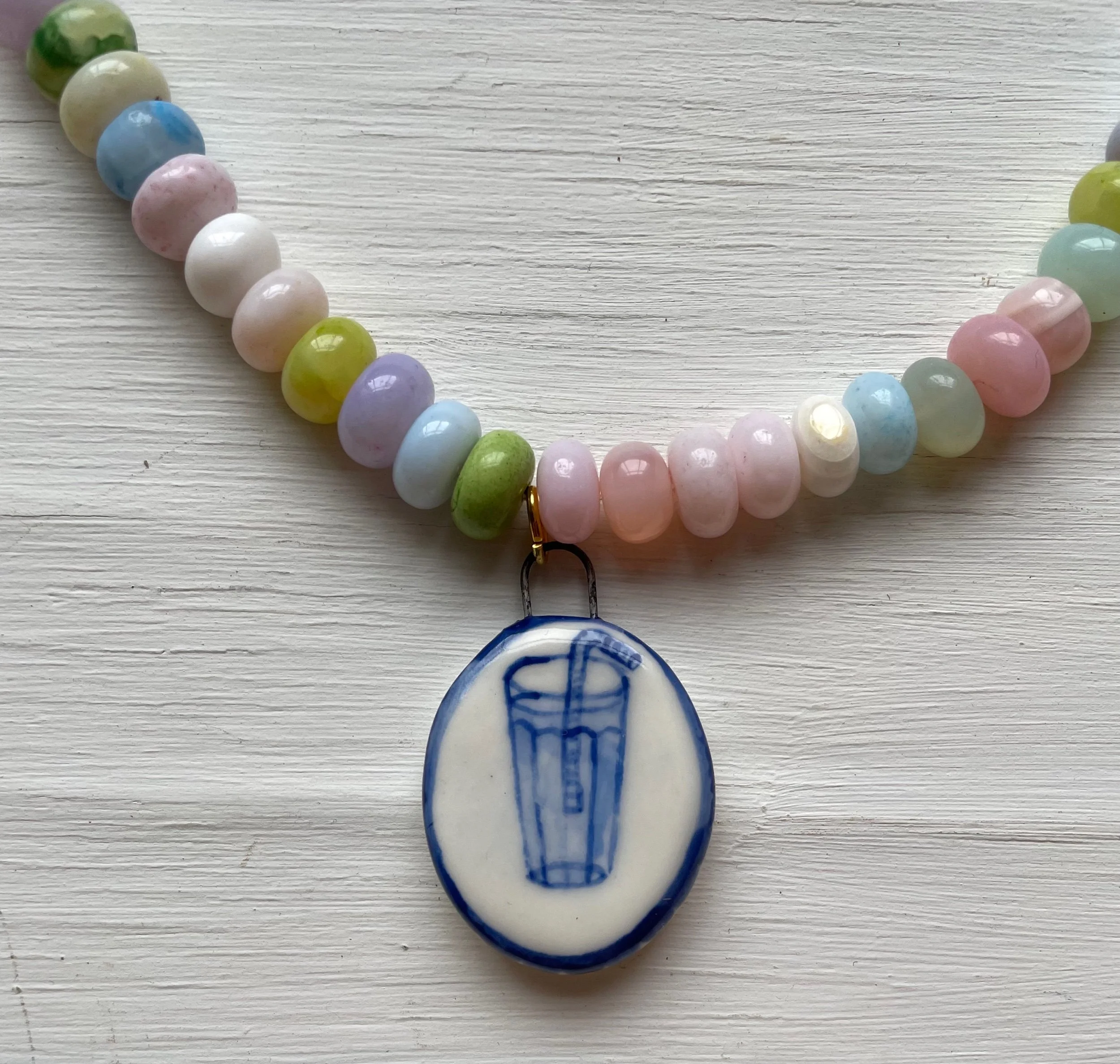 Hand painted porcelain charm on a multicoloured opal beaded necklace with gold plated findings and glass seed beads.