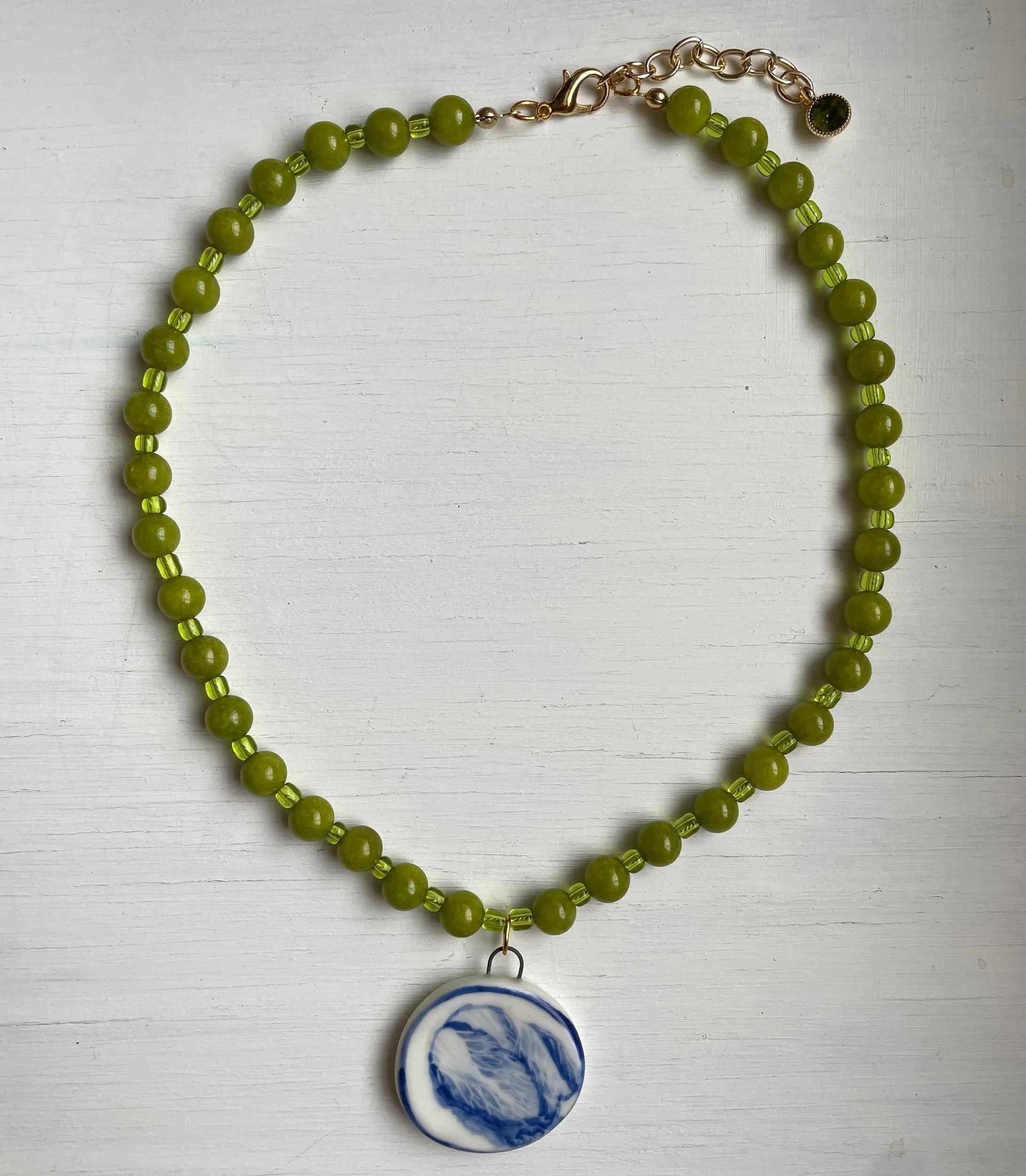 Hand painted porcelain charm on a green aventurine beaded necklace with gold plated findings and glass seed beads.