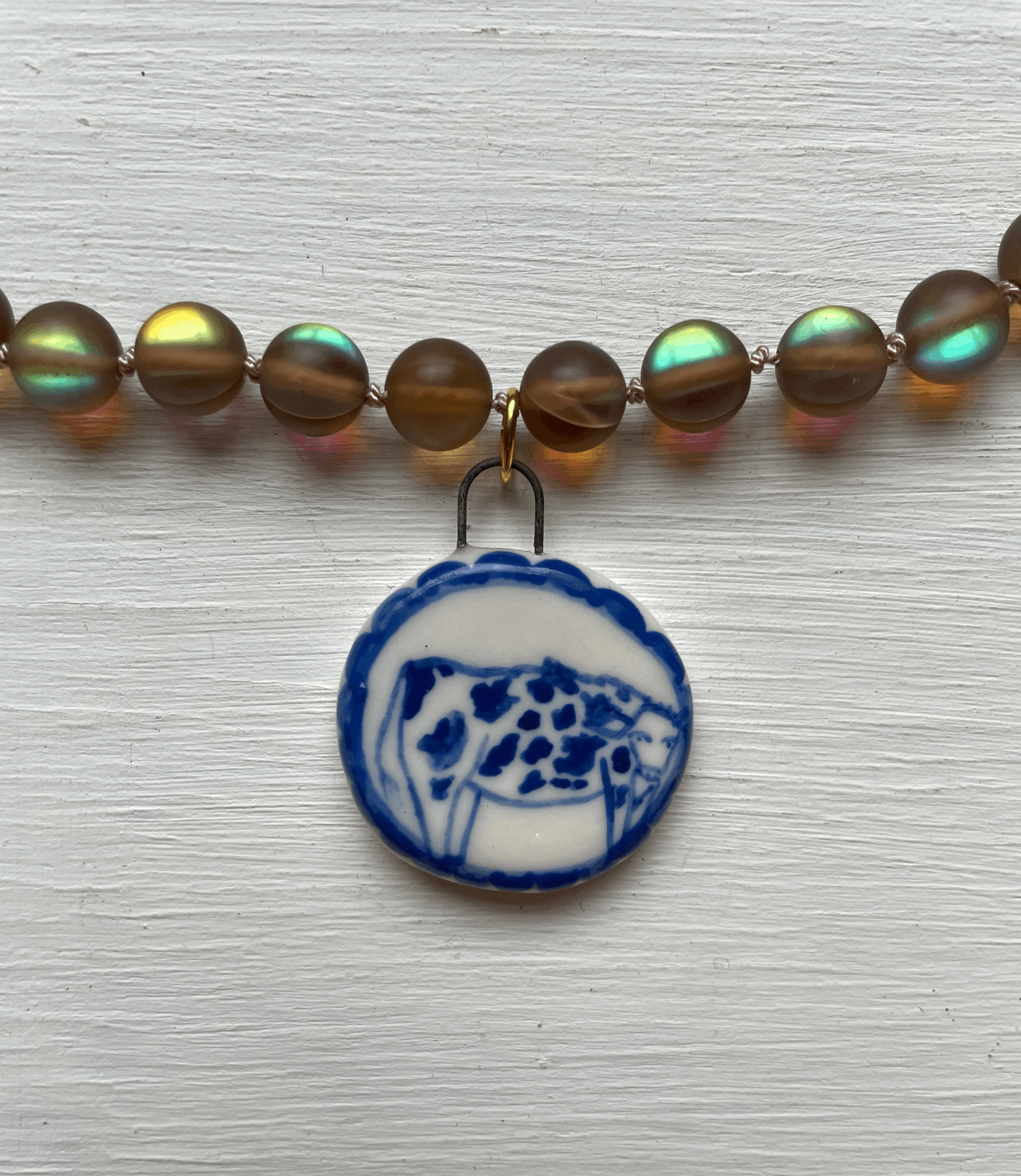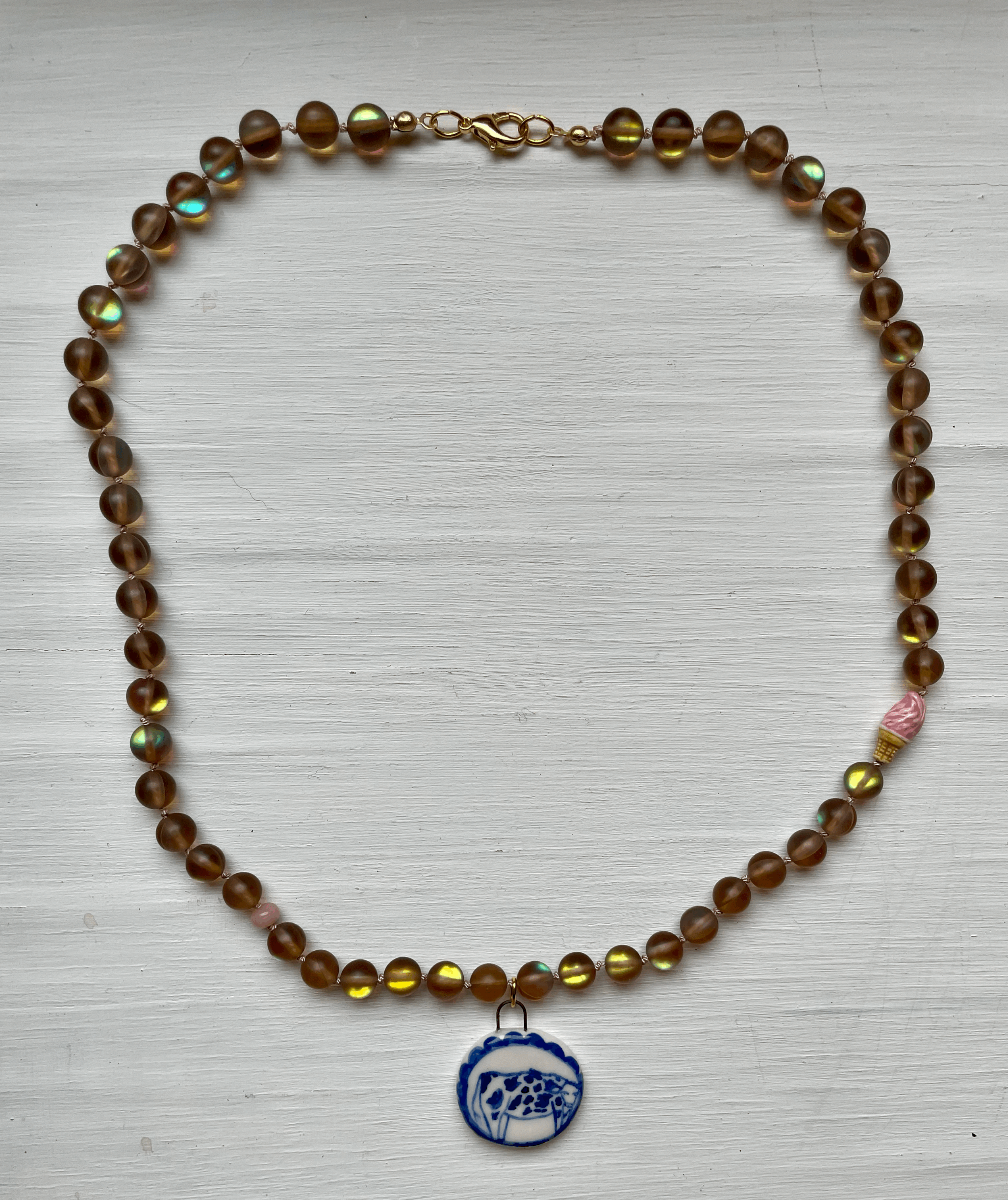 Hand painted porcelain charm on a hydrothermal quartz beads on a hand knotted on pink silk necklace with gold plated findings with ceramic ice cream bead.
