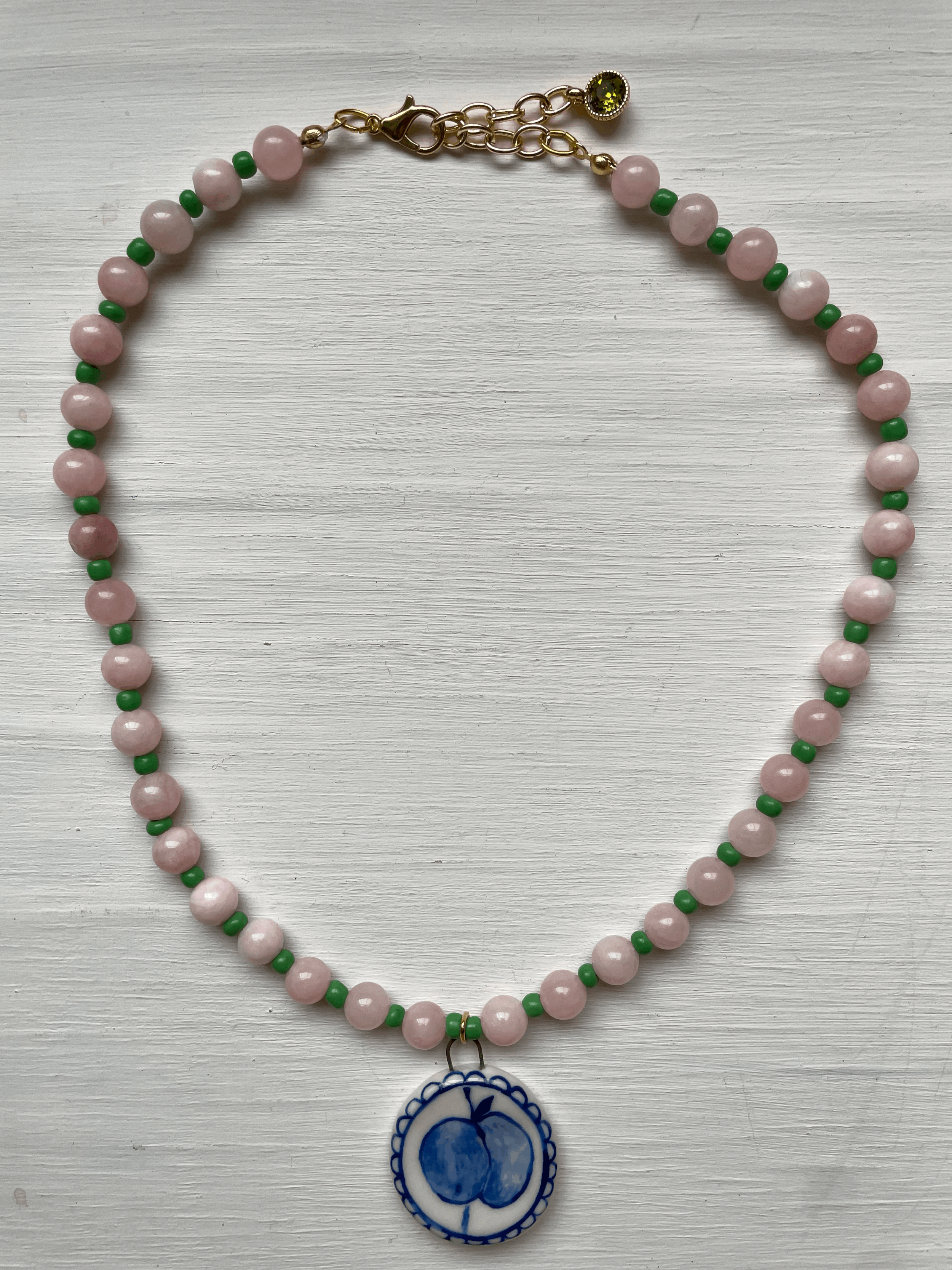 Hand painted porcelain charm on a pink jade beaded necklace with gold plated findings and glass seed beads.