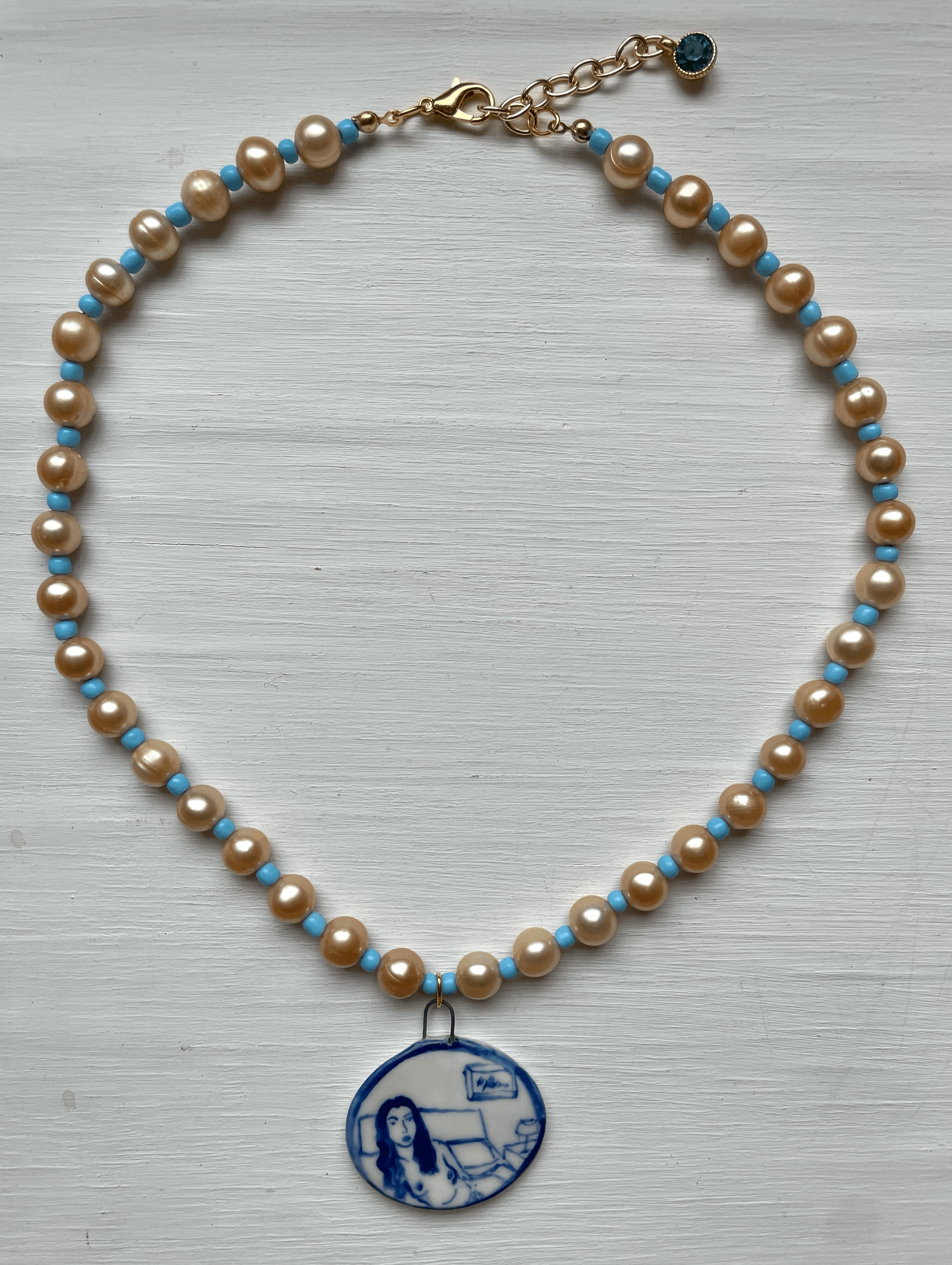 Hand painted porcelain charm on a freshwater pearl necklace with gold plated findings and glass seed beads.