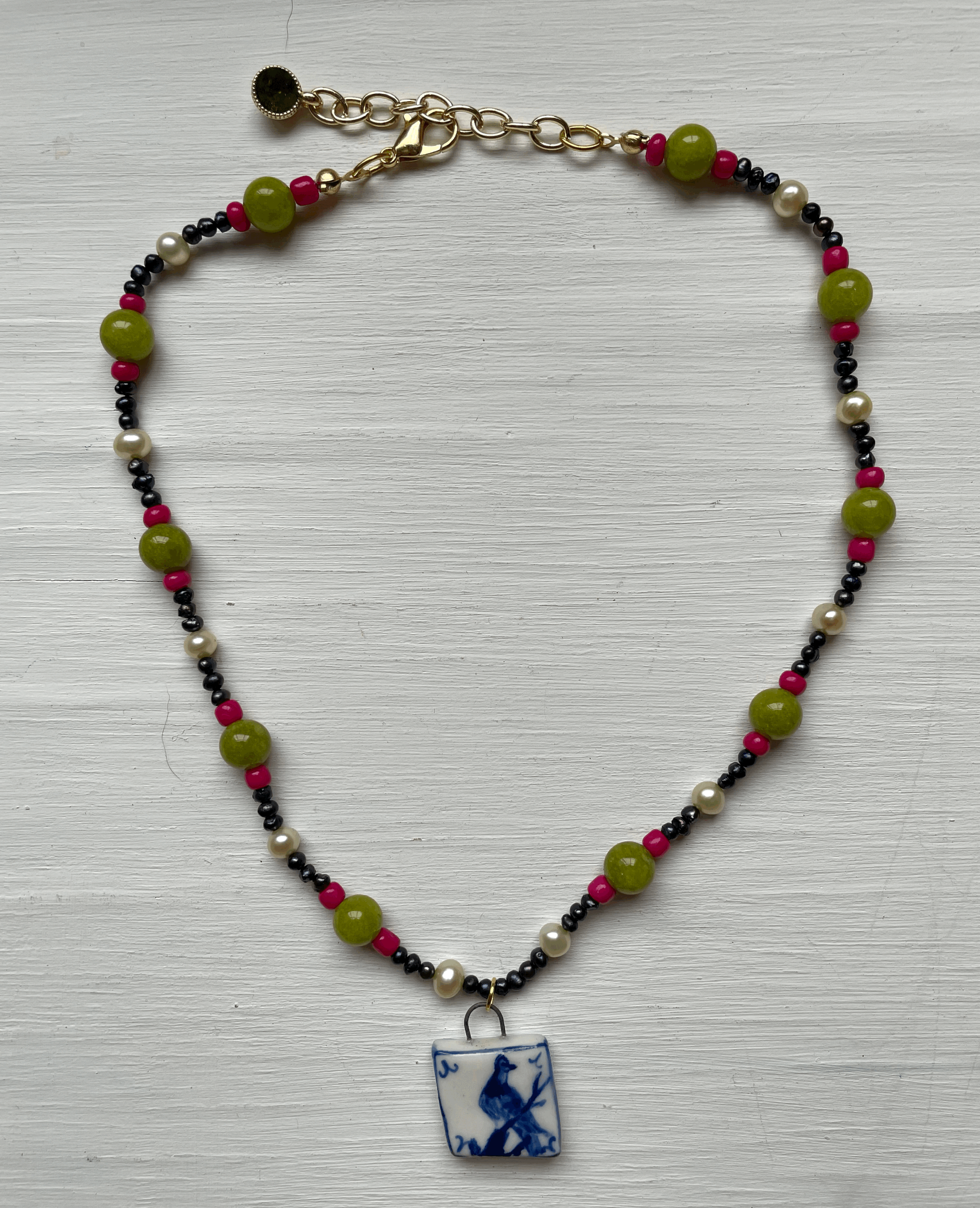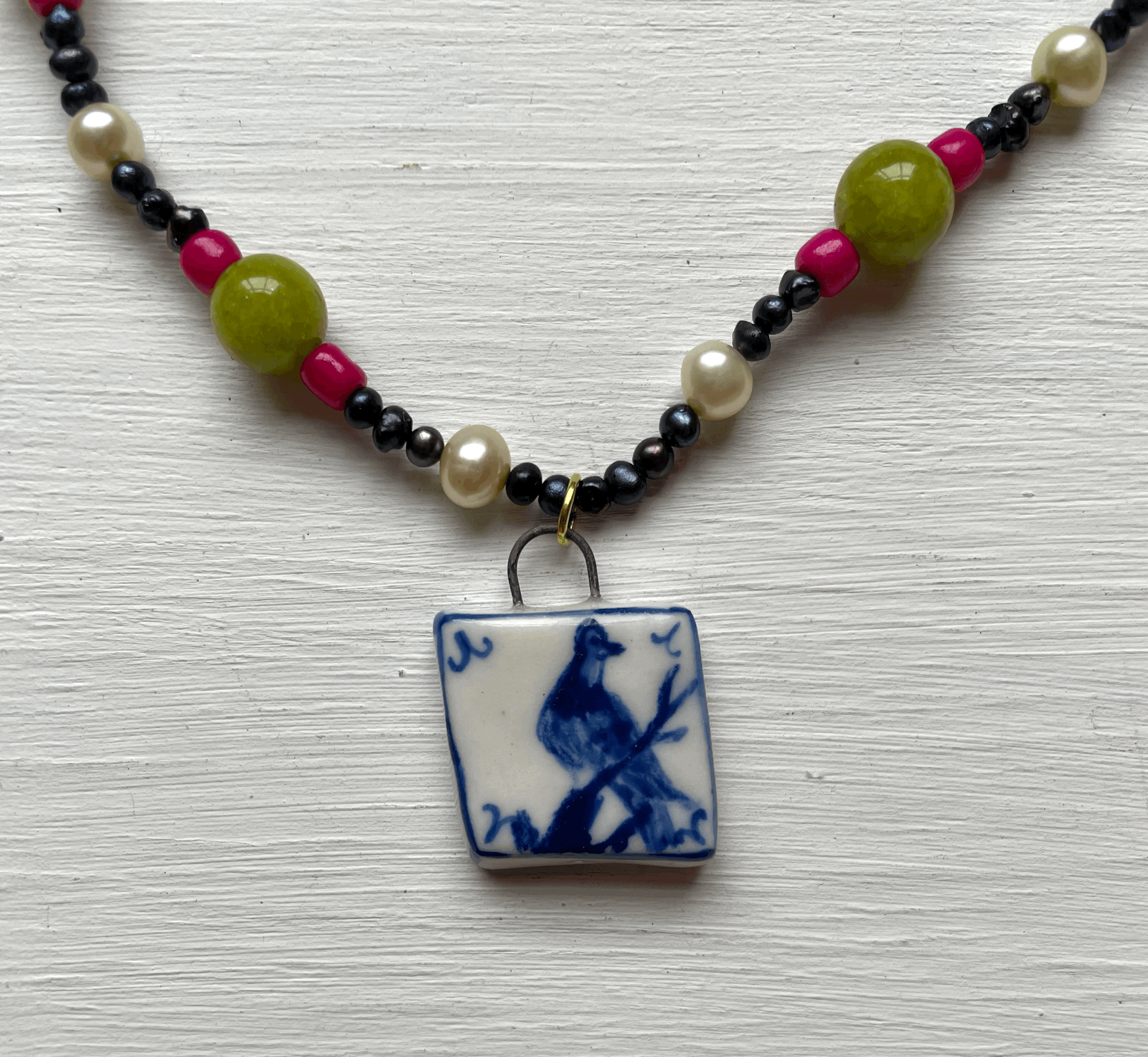 Hand painted porcelain charm on necklace featuring black freshwater pearls, green aventurine and white freshwater potato pearls with gold plated findings.