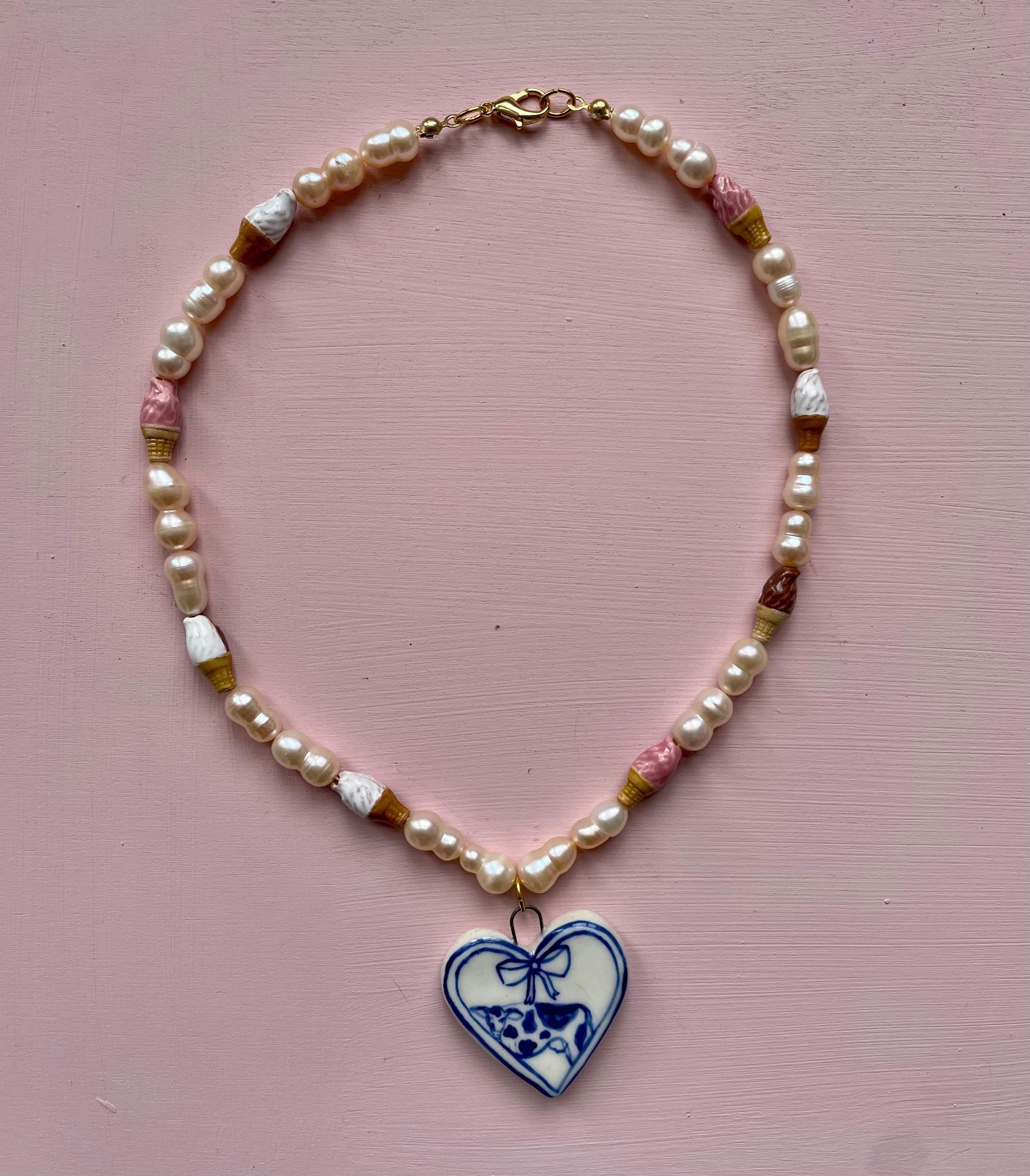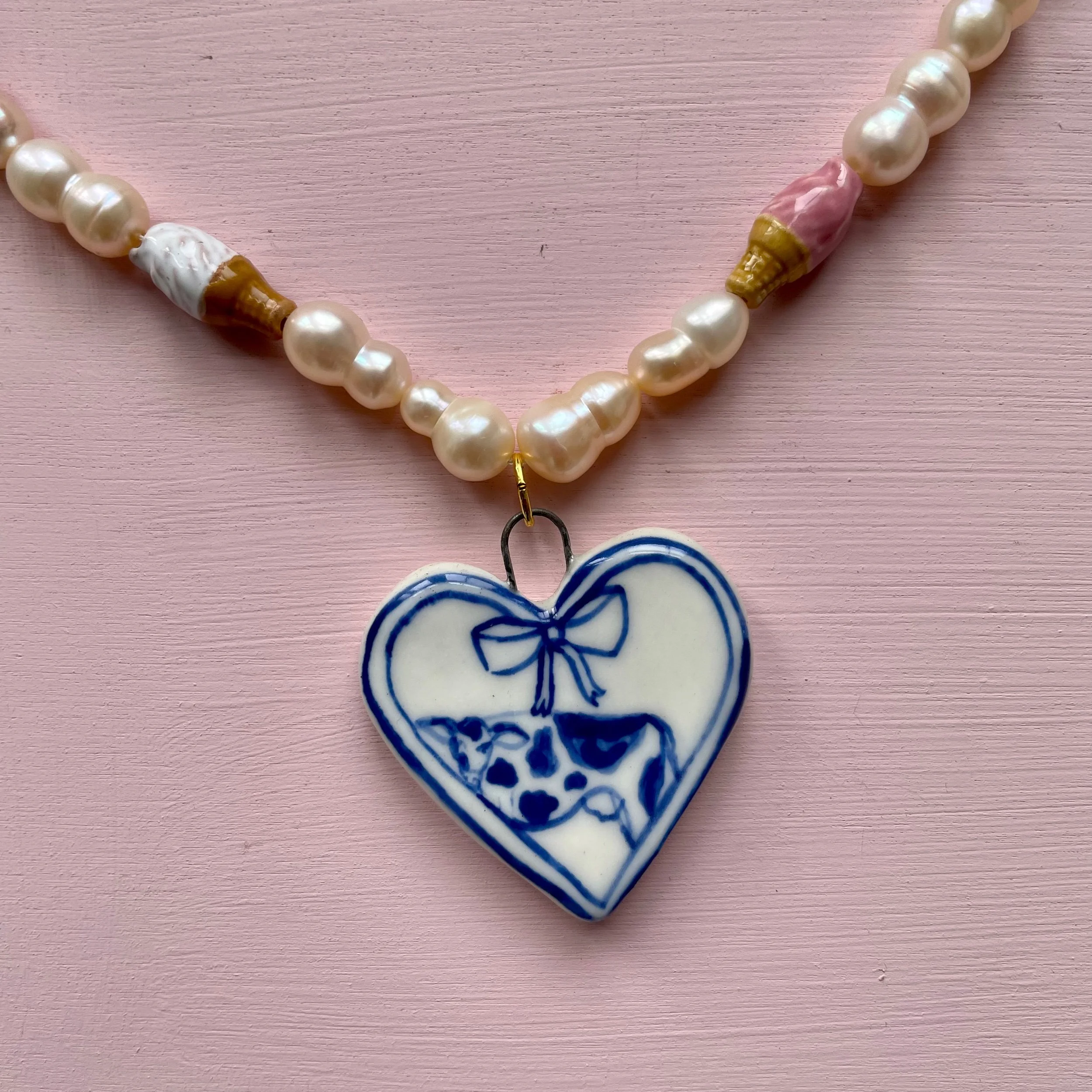 Hand painted porcelain charm on a freshwater pearl necklace with gold plated findings and ceramic beads.