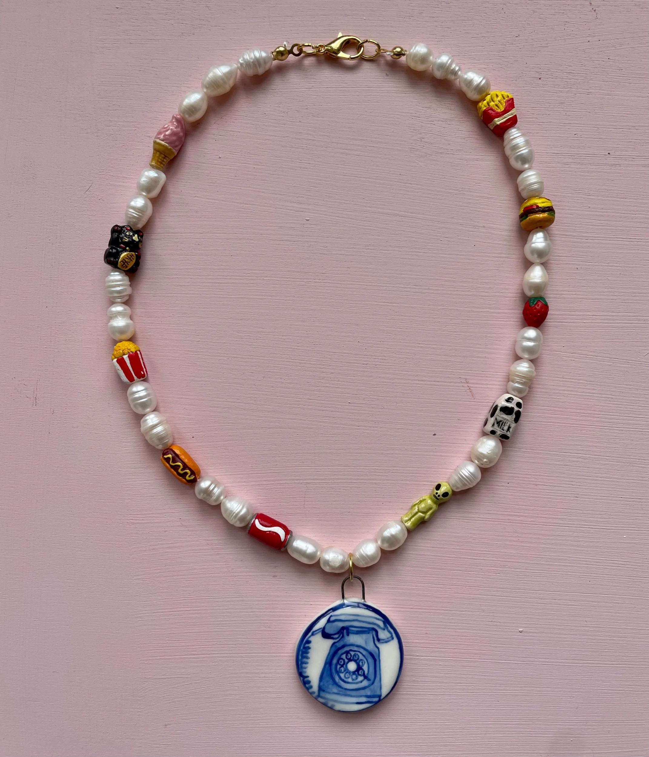 Hand painted porcelain charm on a freshwater pearl necklace with gold plated findings and ceramic beads.