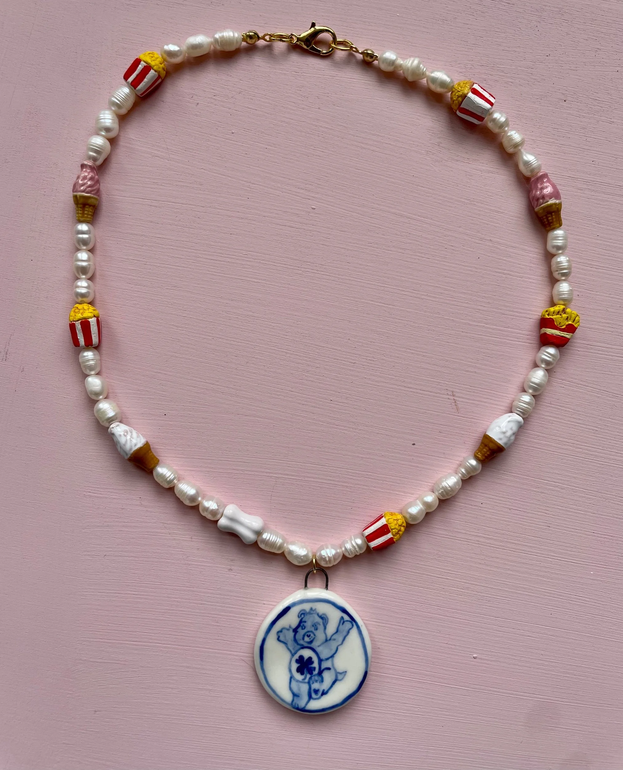 Hand painted porcelain charm on a freshwater pearl necklace with gold plated findings and ceramic beads.