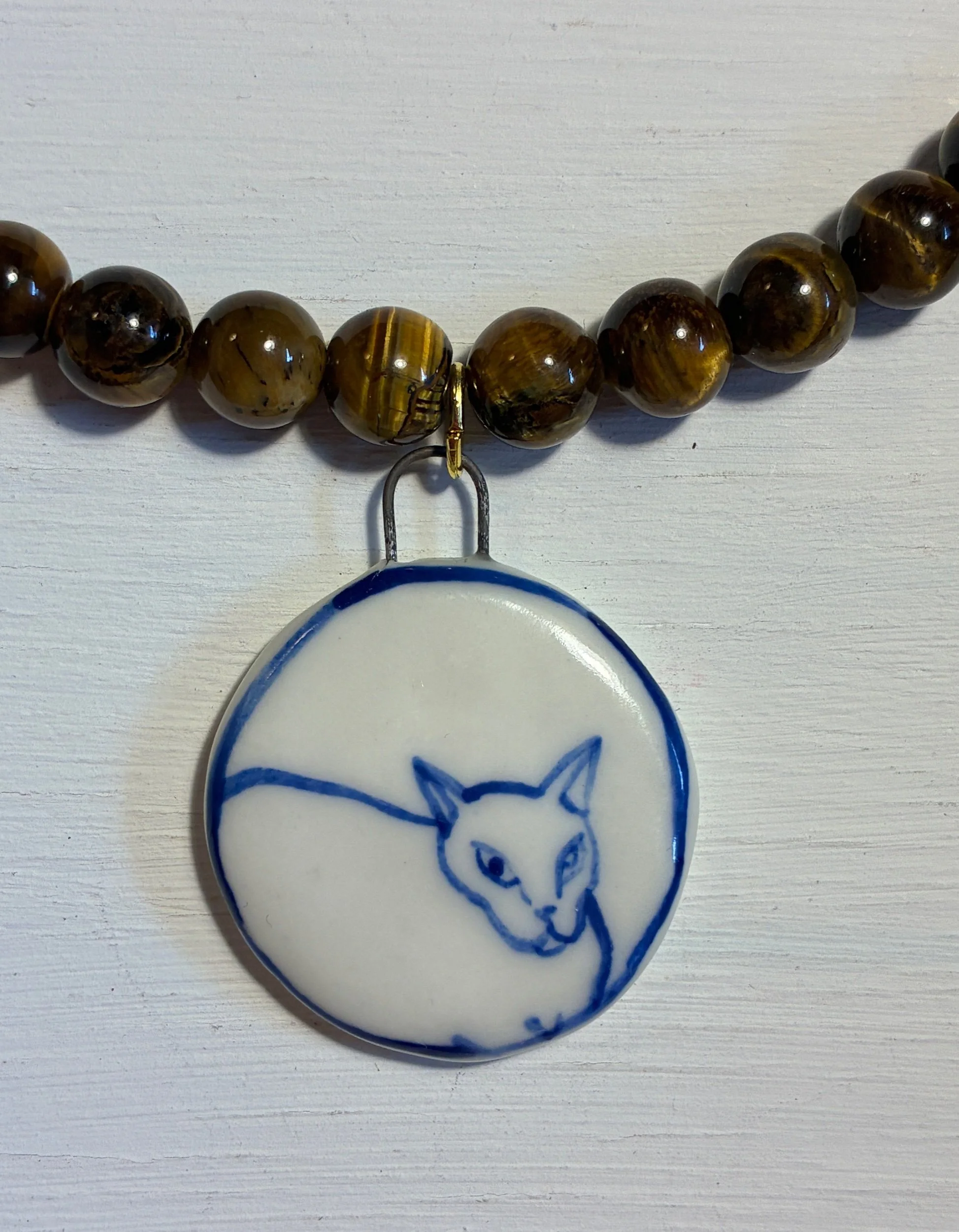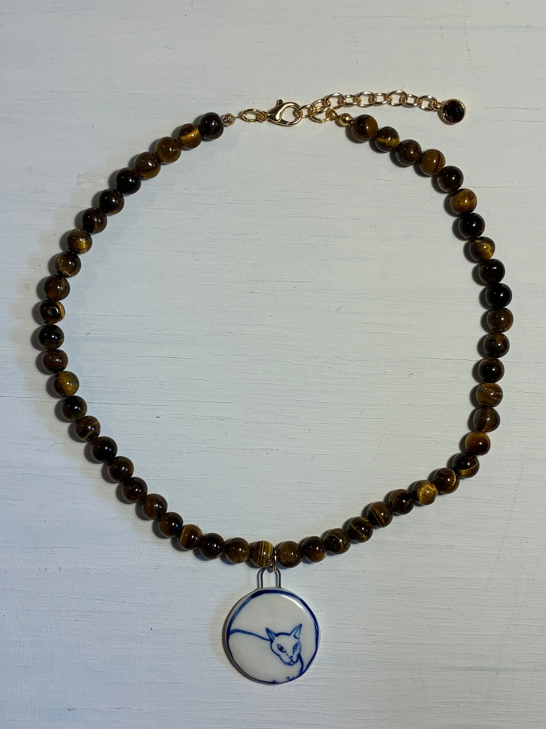 Hand painted porcelain charm on a necklace of 8mm Tigers eye beads with gold plated findings.