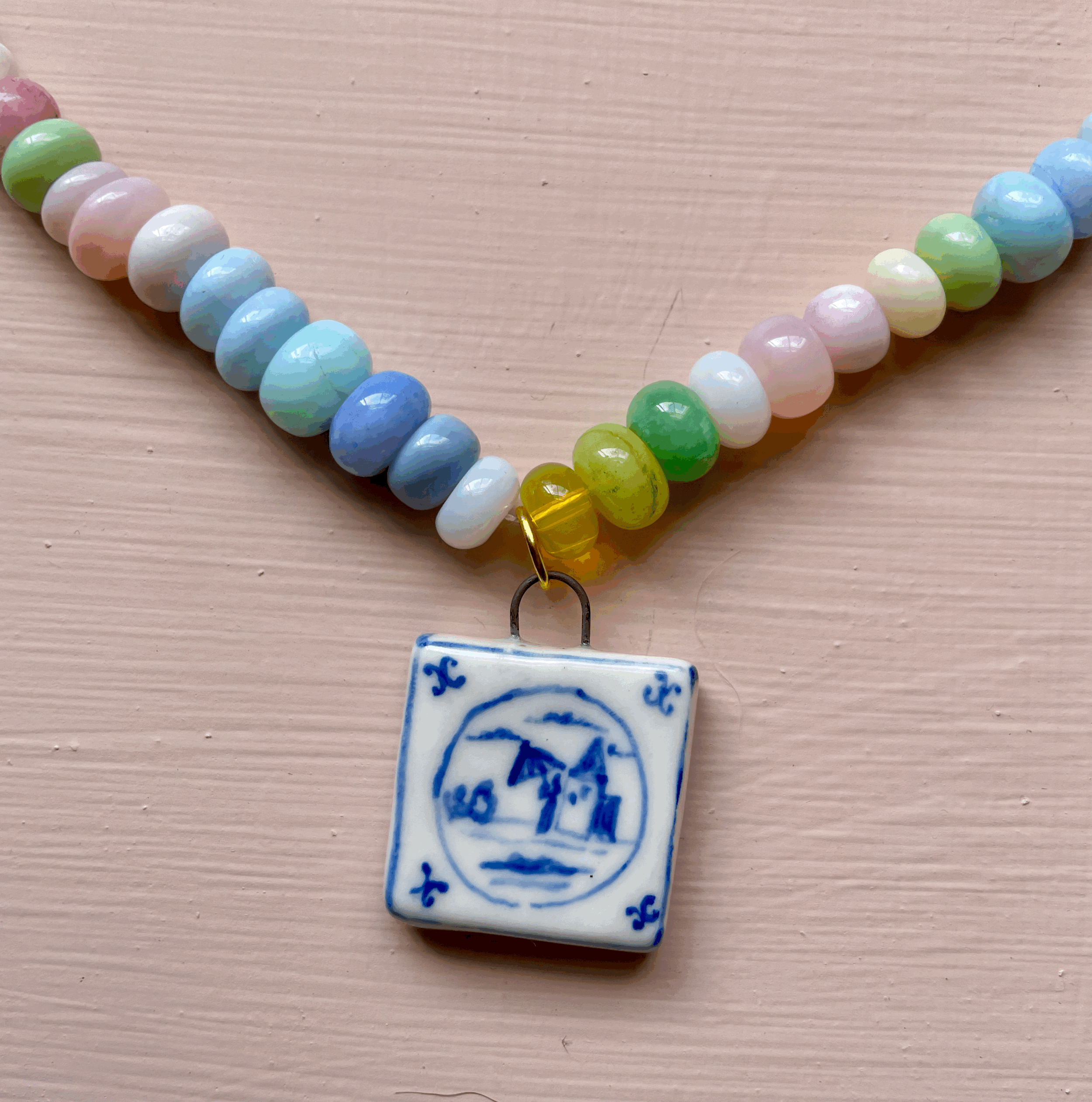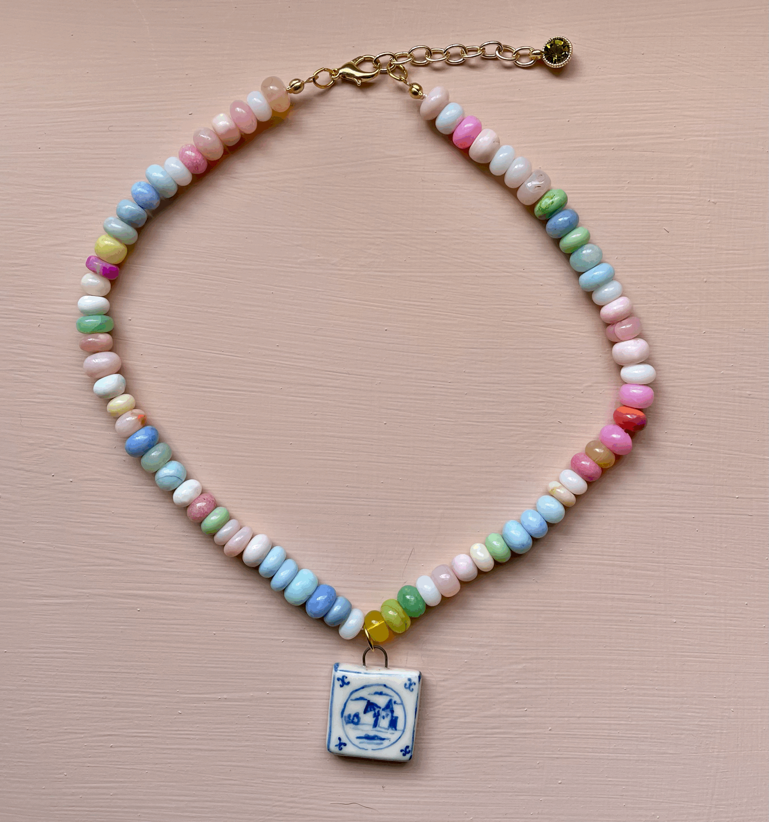 Hand painted porcelain charm on a necklace of mixed opal gemstone beads and gold plated findings.