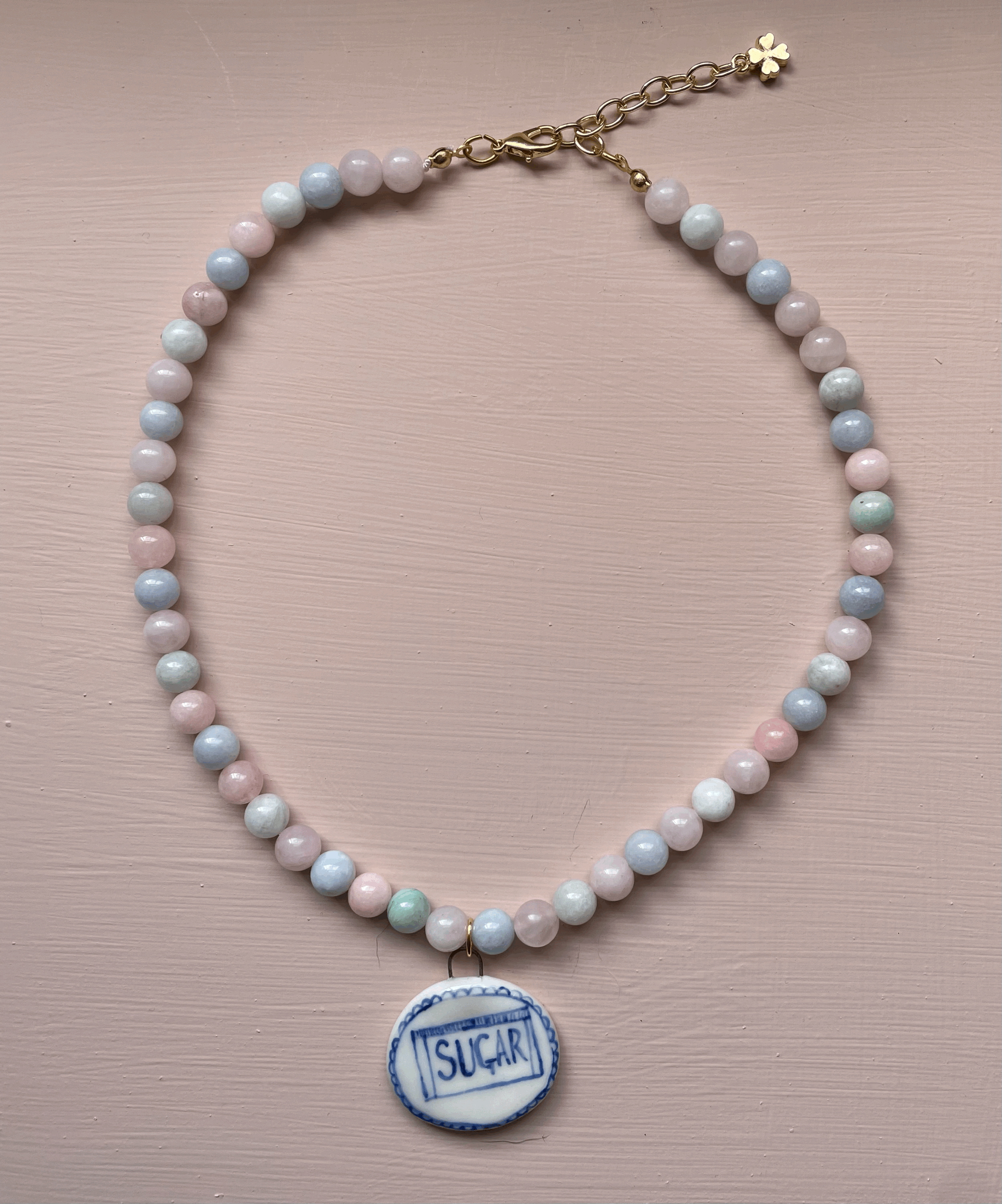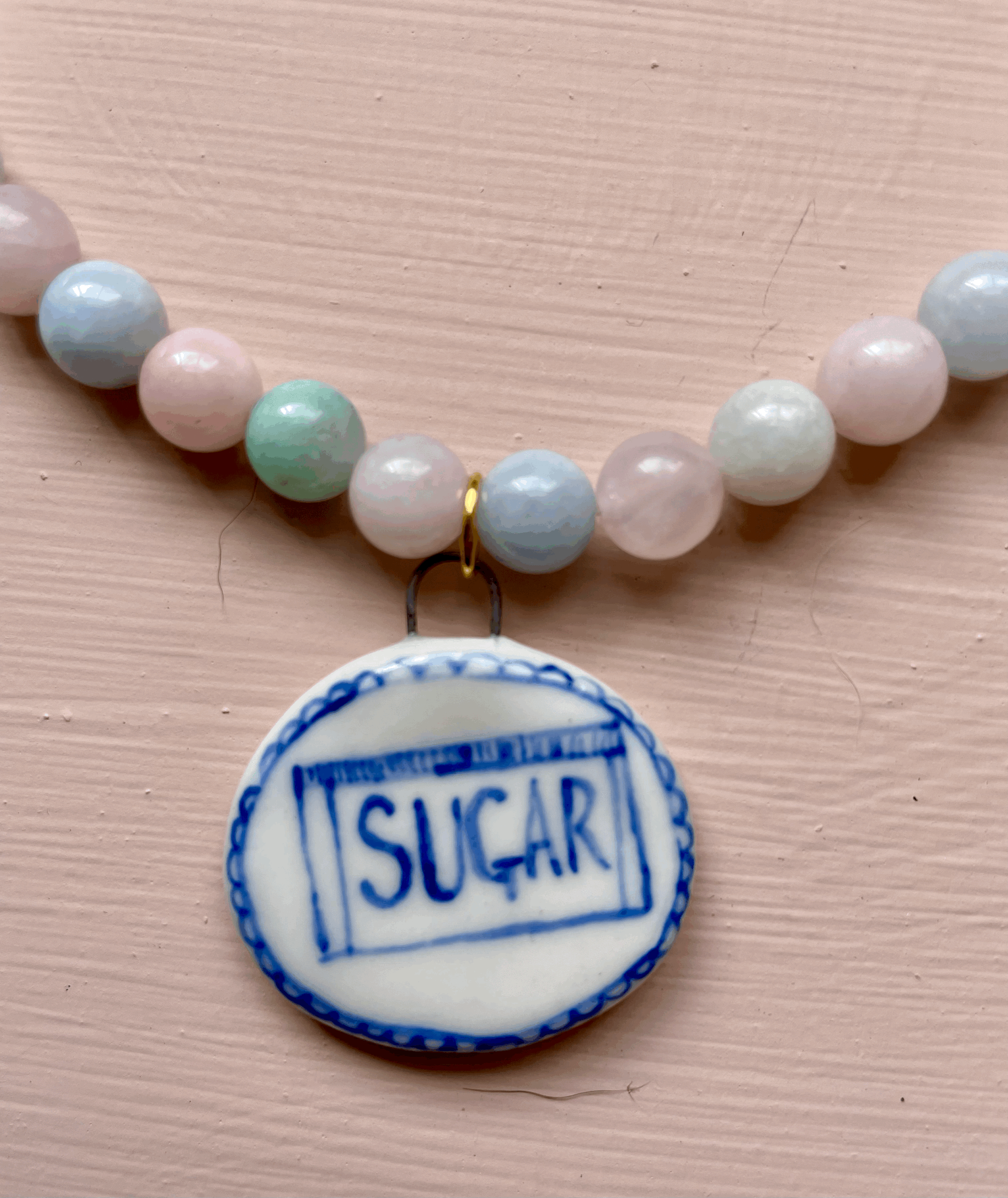Hand painted porcelain charm on a necklace of gemstone beads and gold plated findings.