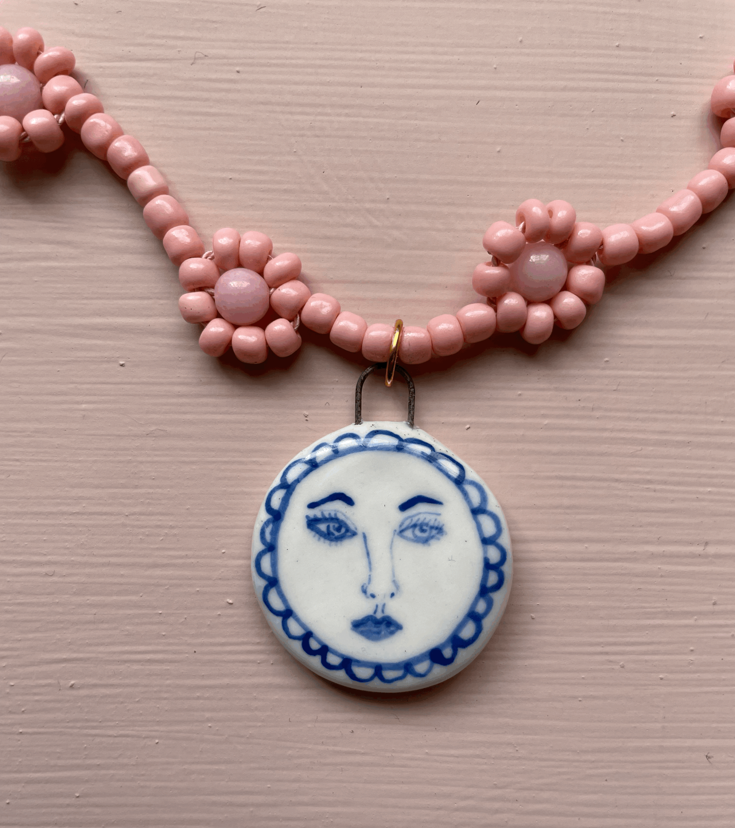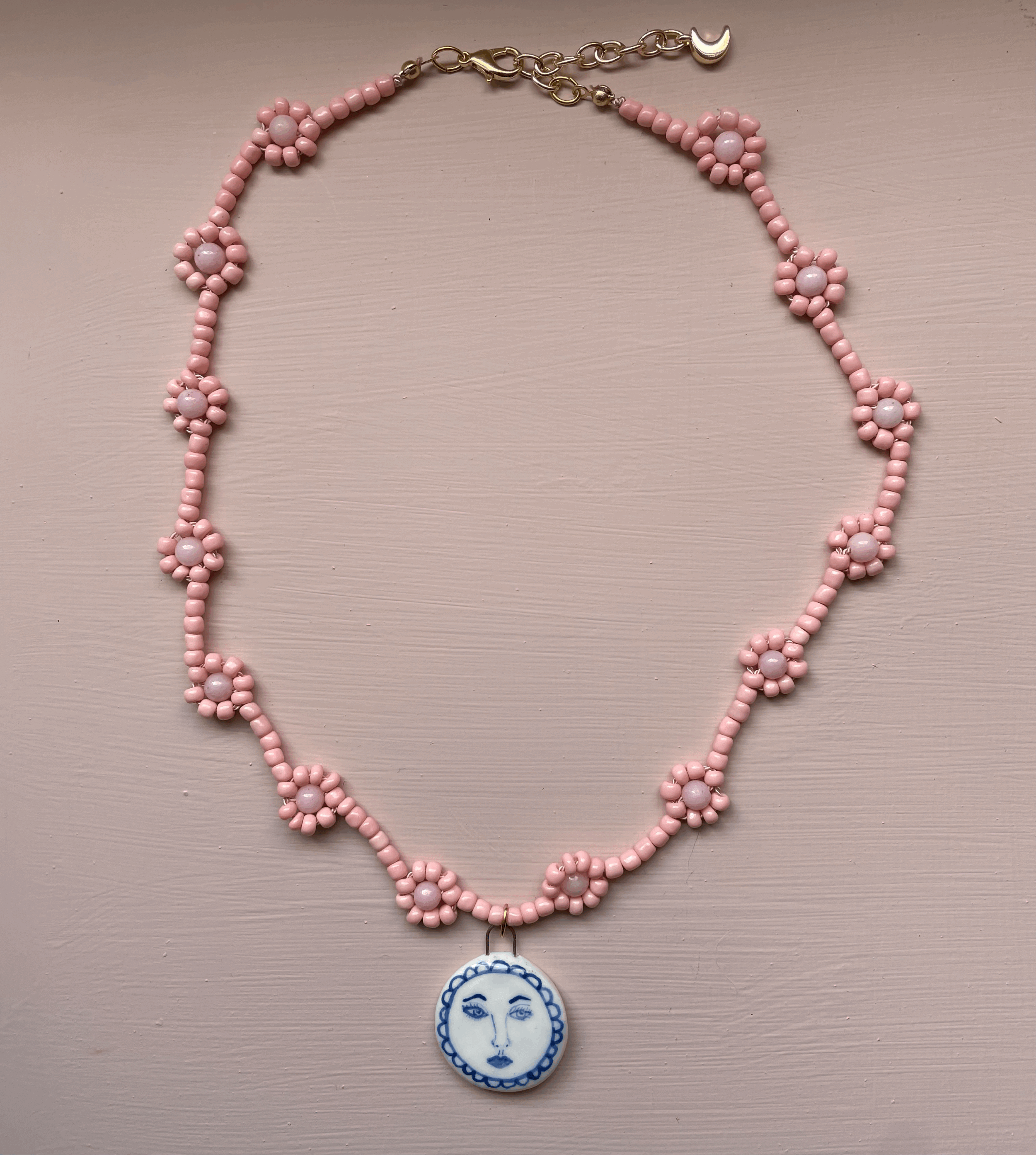 Hand painted porcelain charm on a necklace of glass seed beads and gold plated findings.