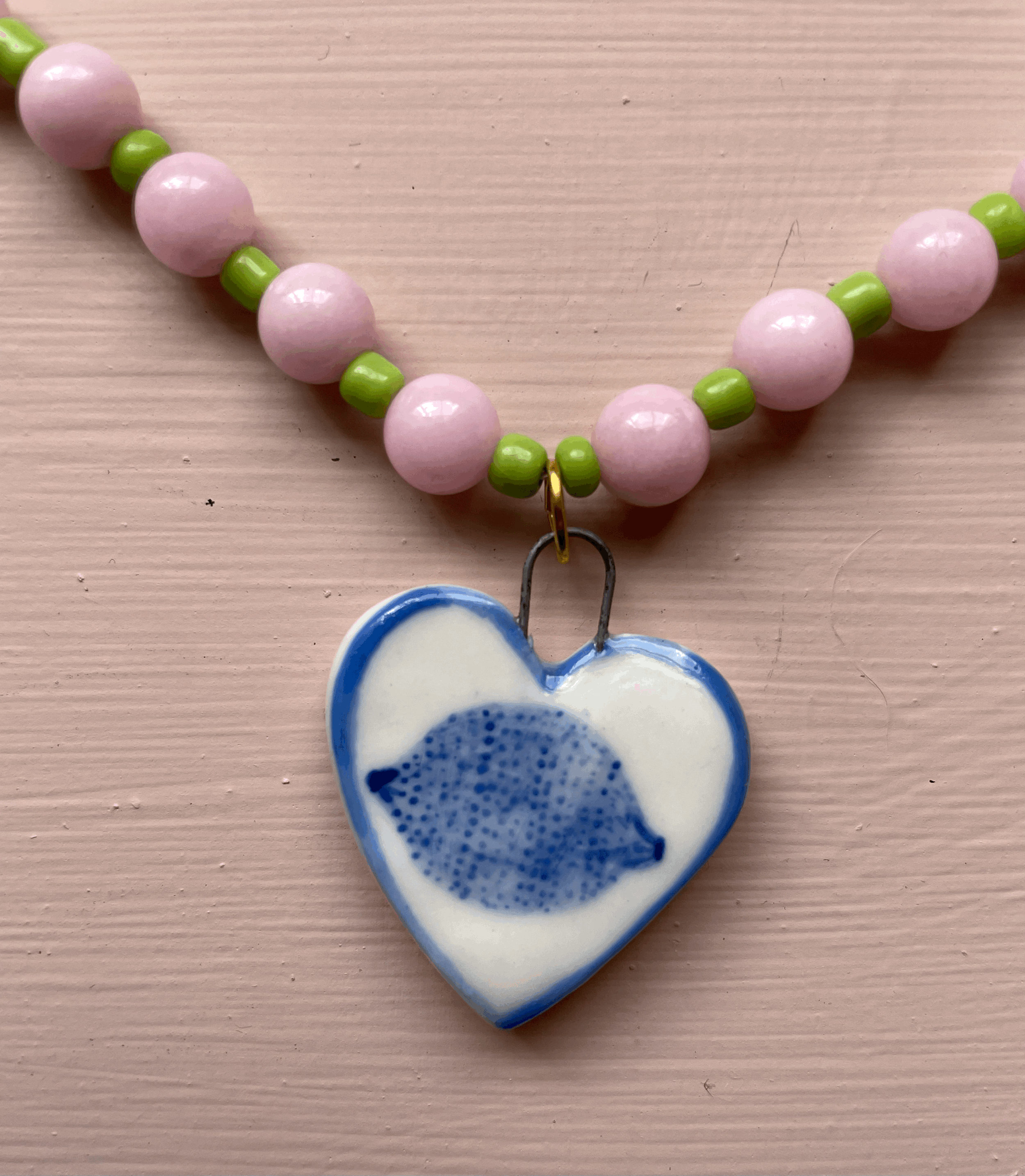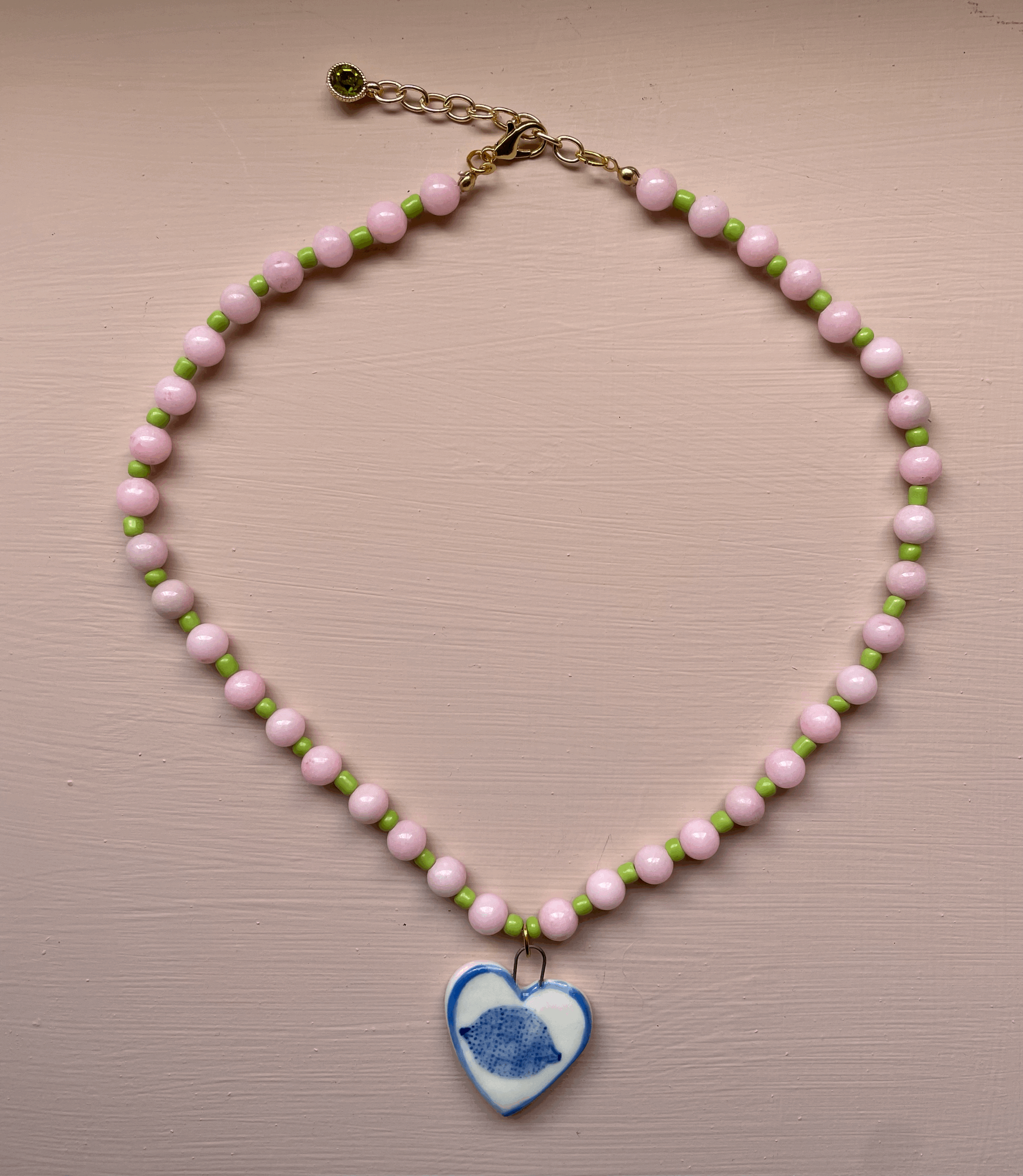 Hand painted porcelain charm on a necklace of gemstone beads, glass seed beads and gold plated findings.