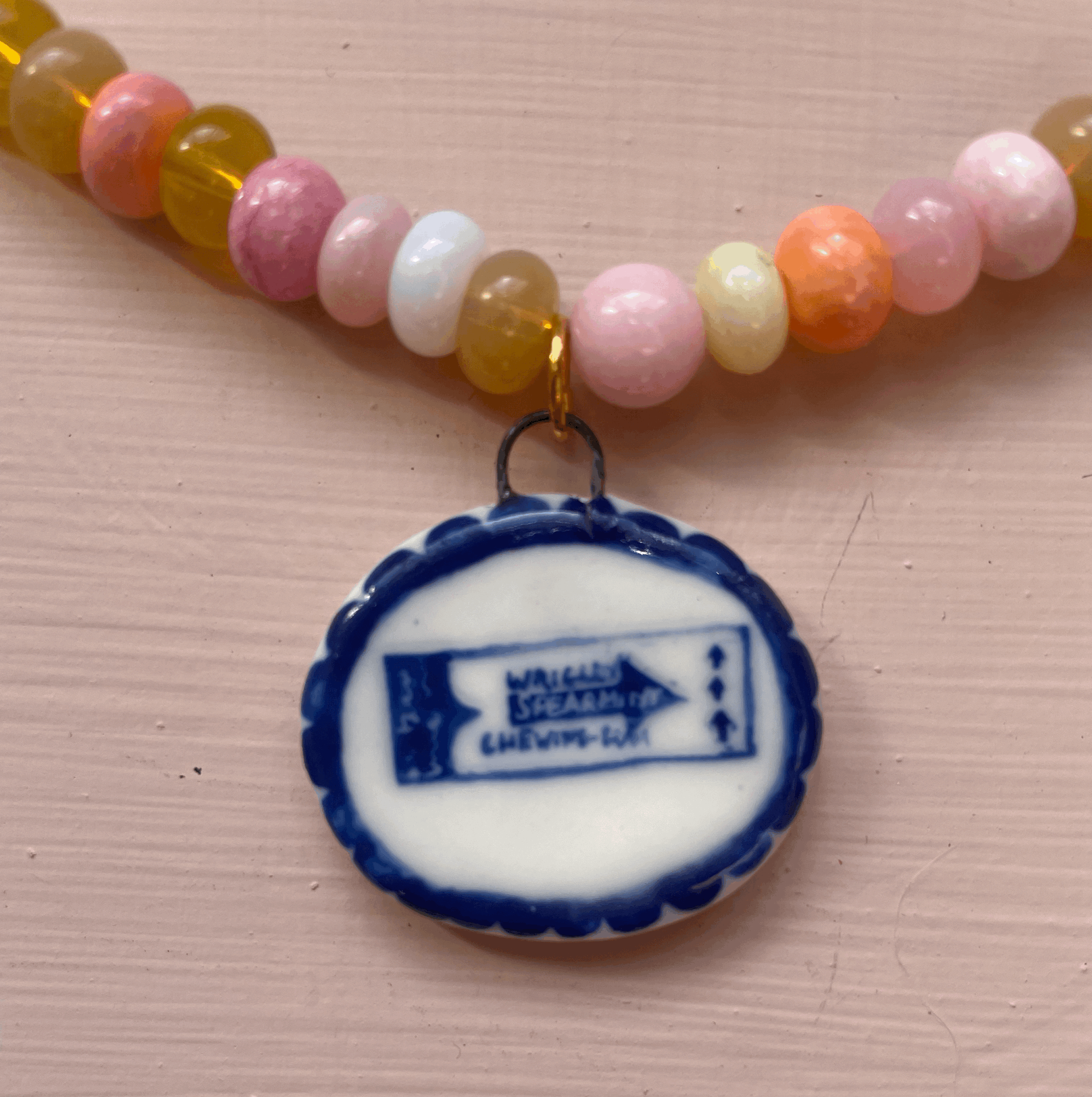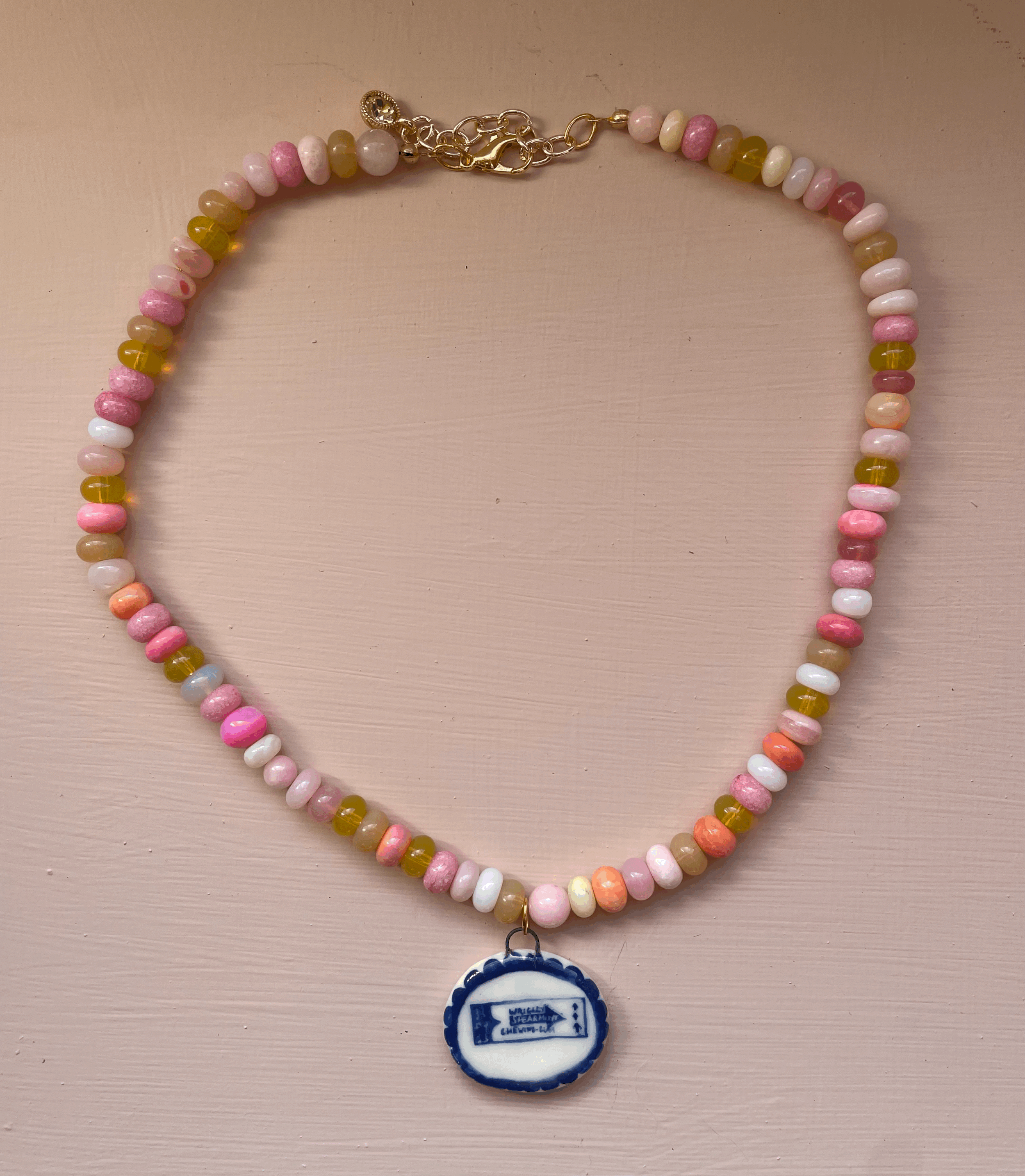 Hand painted porcelain charm on a mixture of gemstone beads and gold plated findings.