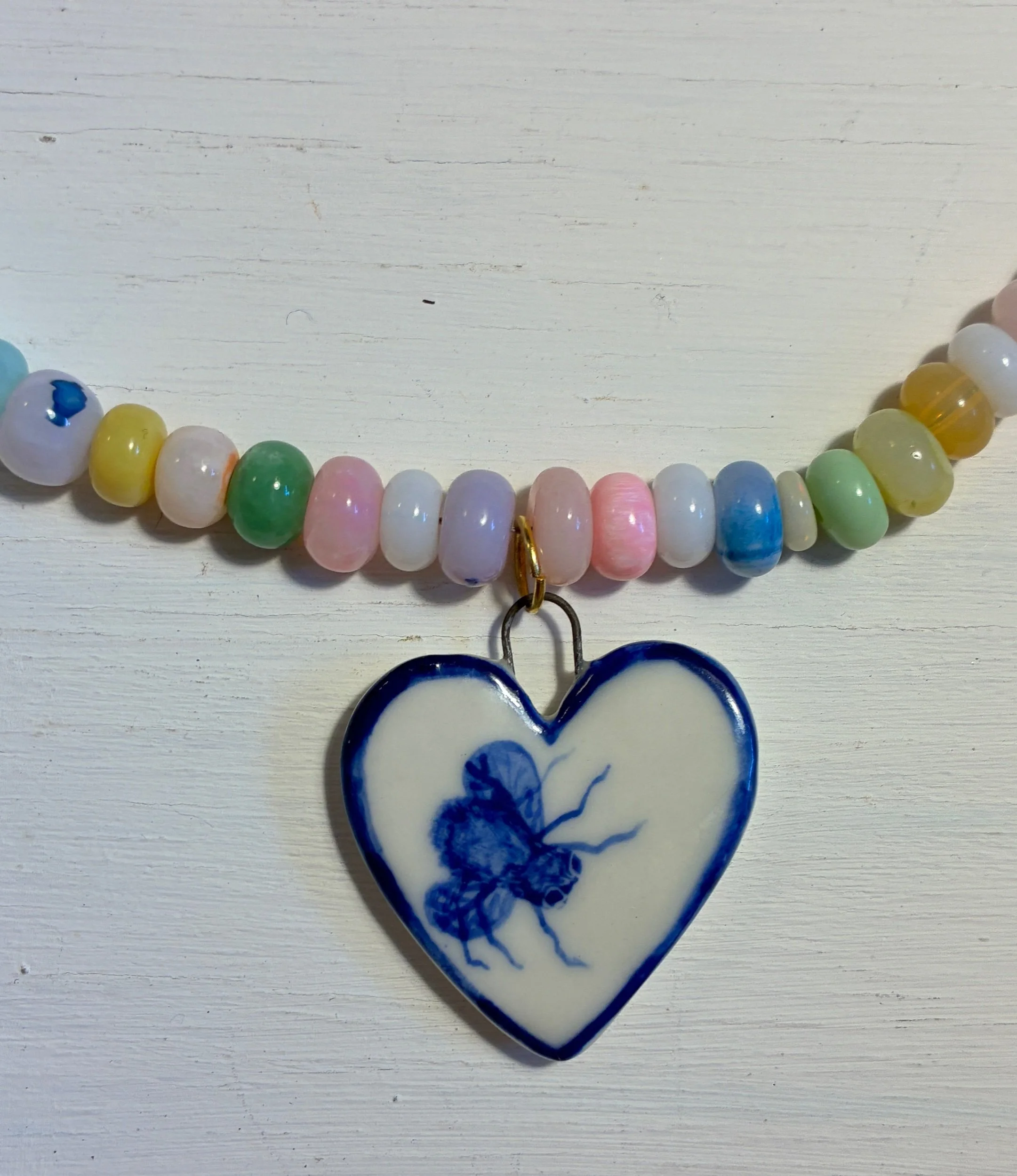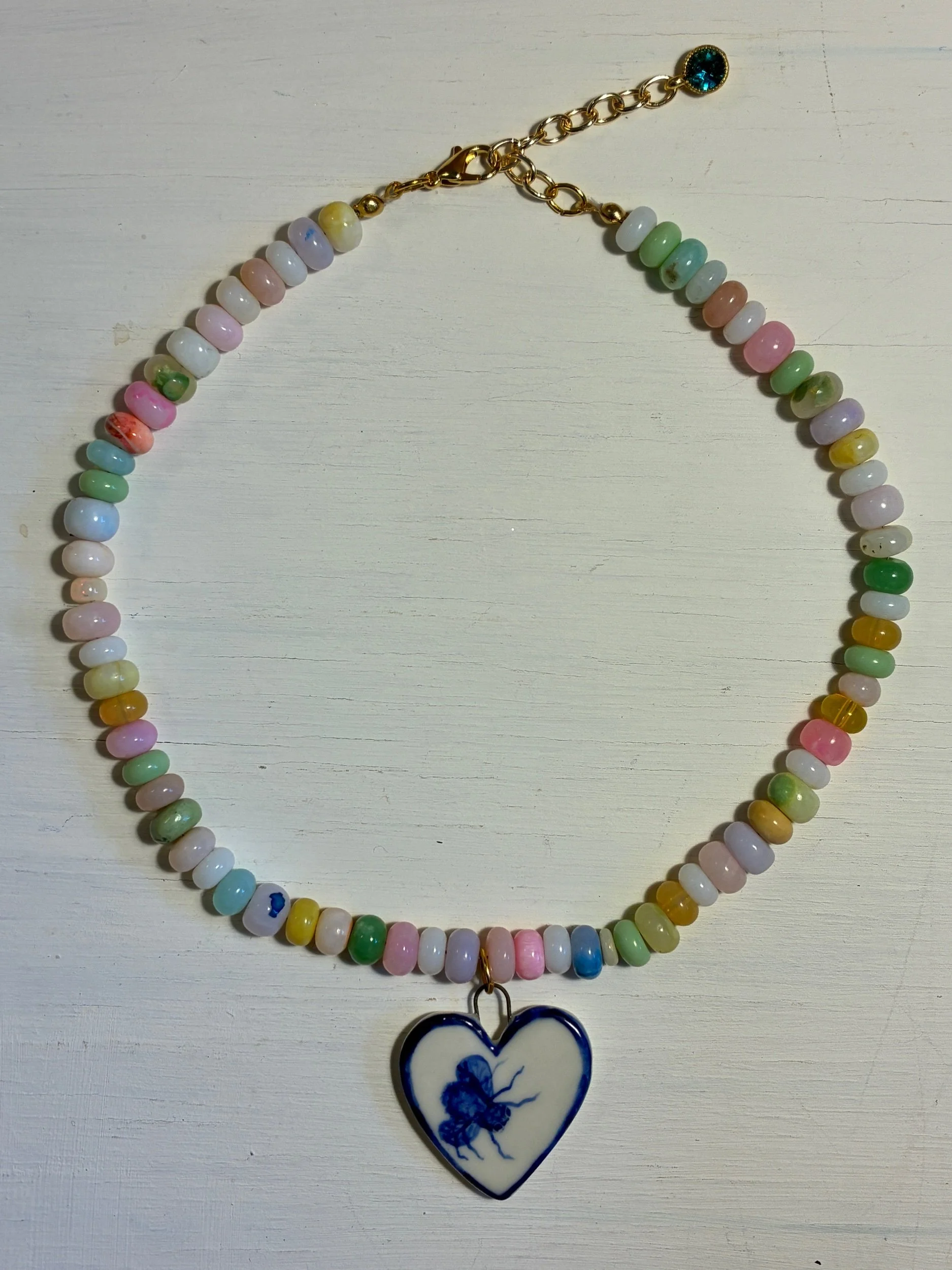 Hand painted porcelain charm on a candy necklace of smooth opal rondelle beads with gold plated findings.