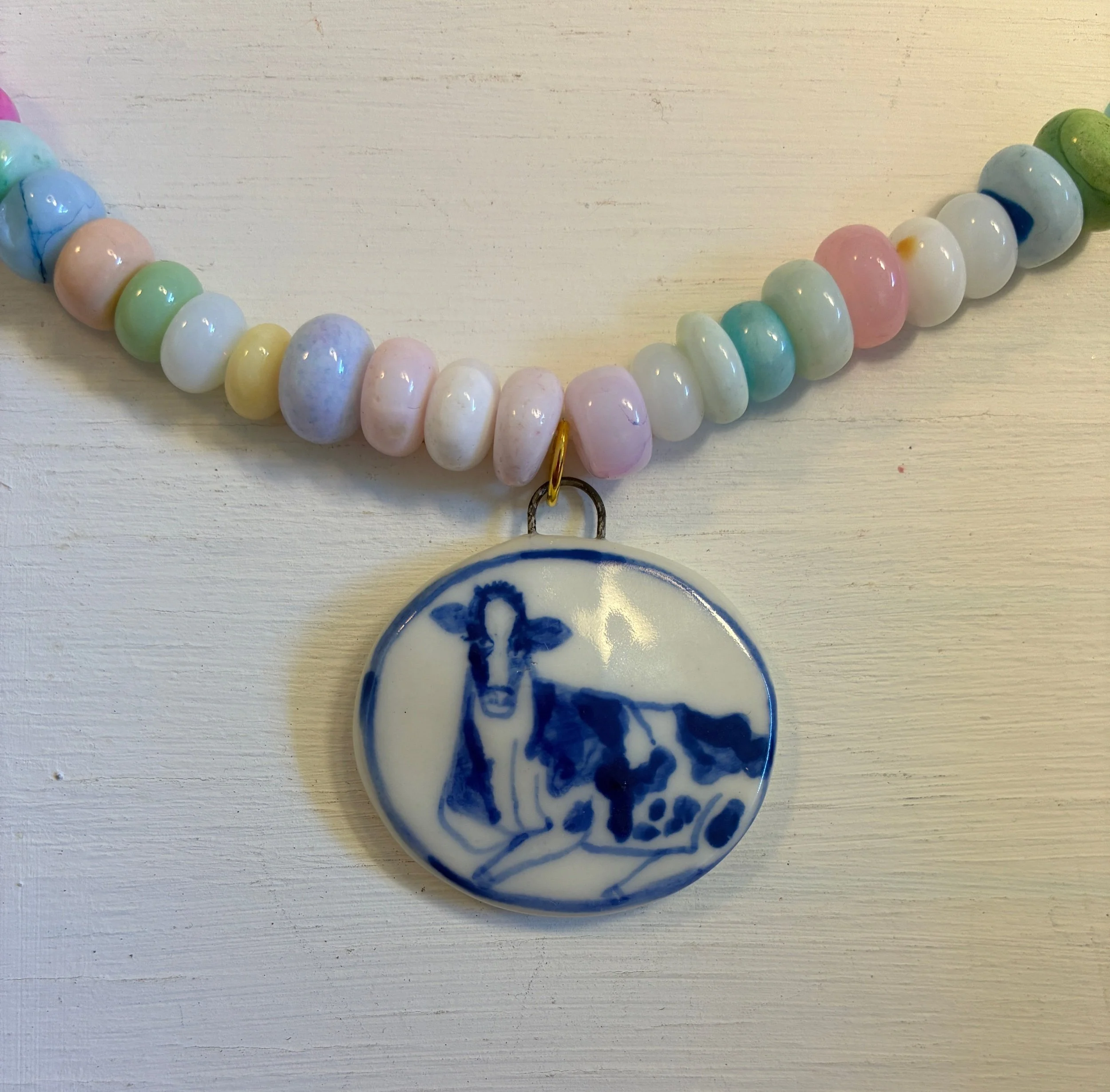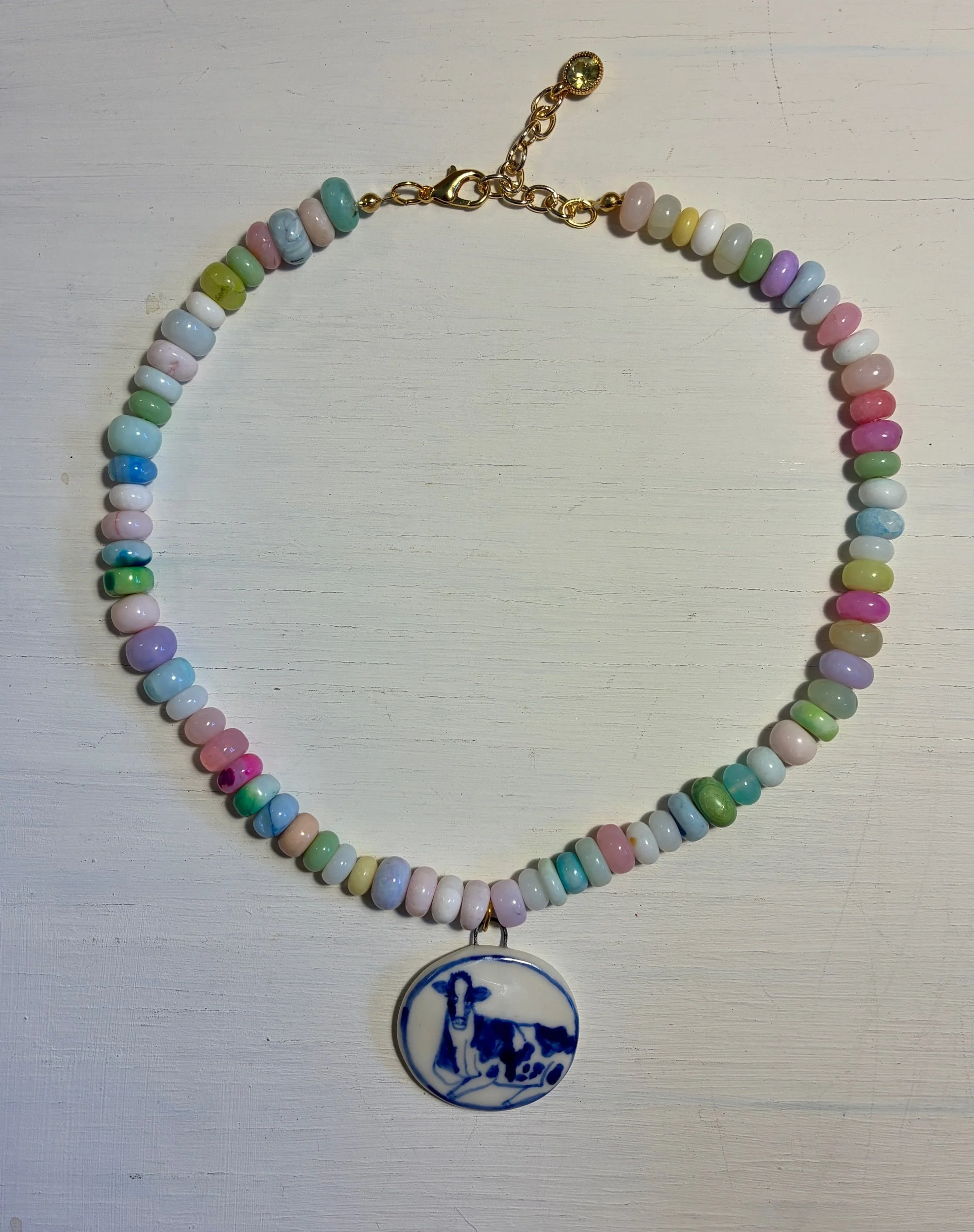 Hand painted porcelain charm on a candy necklace of smooth opal rondelle beads with gold plated findings.